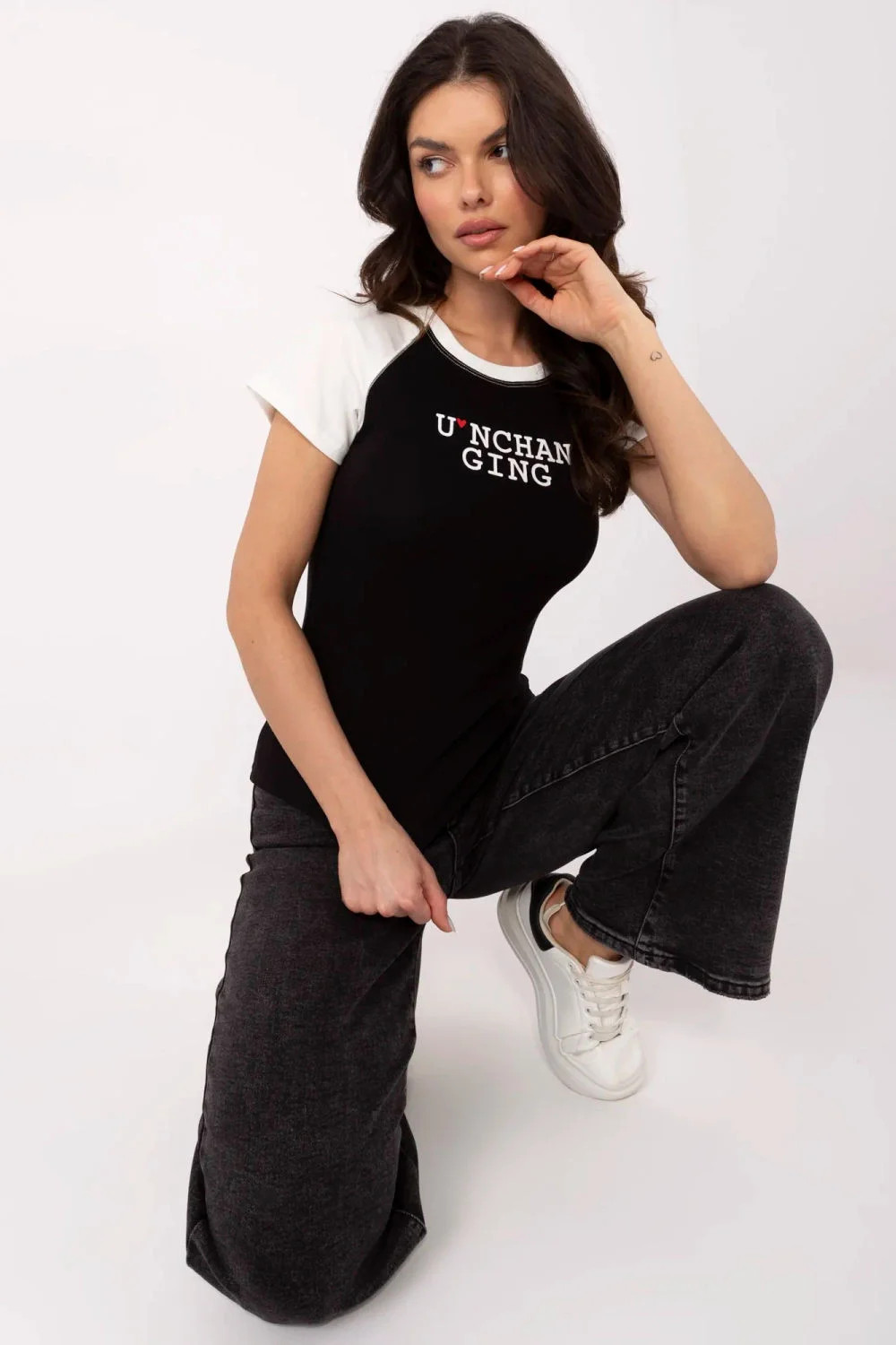 Dámské tričko v casual stylu je kombinací pohodlí a módního designu. Vyrobeno z měkké, žebrované bavlny s přídavkem elastanu, zajišťuje pohodlí nošení a skvělé přizpůsobení postavě. Klasický, kulatý výstřih a krátké rukávy jsou vyrobeny z kontrastního materiálu, který tričku dodává výjimečný charakter. Na přední straně je umístěn stylový potisk s nápisy, který zdůrazňuje moderní a uvolněný styl. Standardní délka z něj činí skvělou kombinaci jak s džínami, tak s sukněmi, vytvářející univerzální základ pro každodenní outfit.