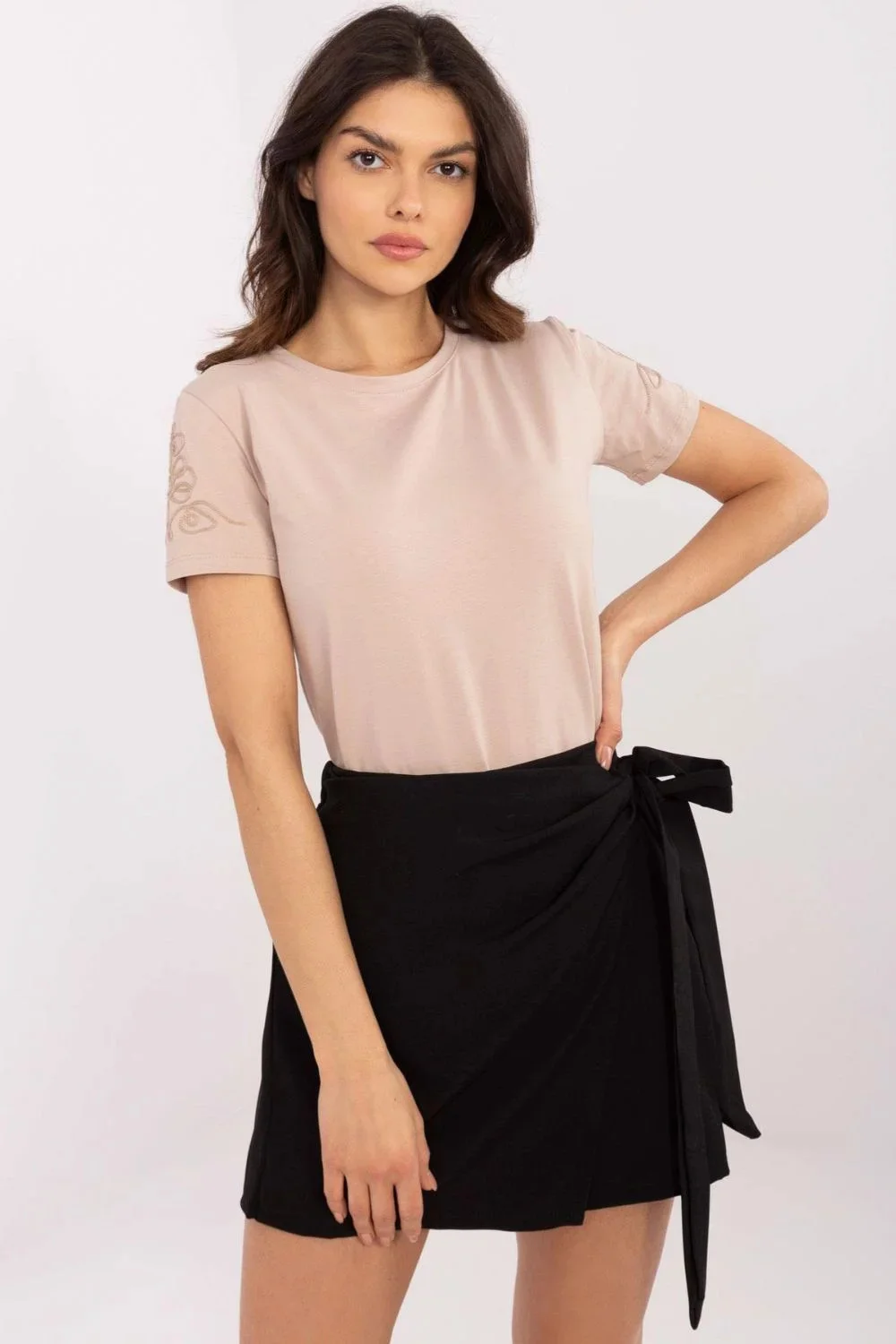 Dámské tričko v casual stylu, ideální na každý den. Vyrobeno z měkké směsi bavlny a elastanu, poskytuje pohodlí a pružnost, přizpůsobující se postavě. Hladký materiál zdůrazňuje jednoduchost a univerzálnost modelu. Krátké rukávy a kulatý výstřih vytvářejí klasický střih, který se hodí k mnoha outfitům. Dekorativní vyšívaní na rukávech dodává tričku decentní, ale originální akcent, dávající mu výjimečný charakter. Ideální volba pro každodenní, casual outfity.
