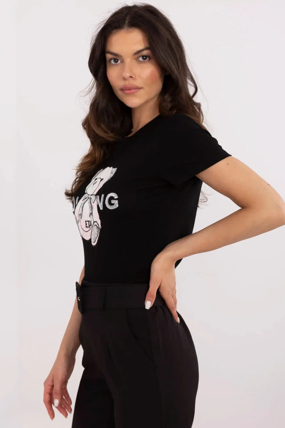 Půvabný a stylový dámský tričko, ideální na každý den. Vyrobena z jemné bavlny s přídavkem elastanu, poskytuje pohodlí nošení a skvělé přizpůsobení postavě. Klasický, kulatý výstřih a standardní délka z něj dělají vhodný k mnoha stylizacím. Krátký rukáv dodává lehkost a originální detaily, jako je vyšívaný medvídek s flitry, mu dodávají výjimečný charakter. Ideální volba pro ženy, které ocení ležérní styl s módními akcenty.