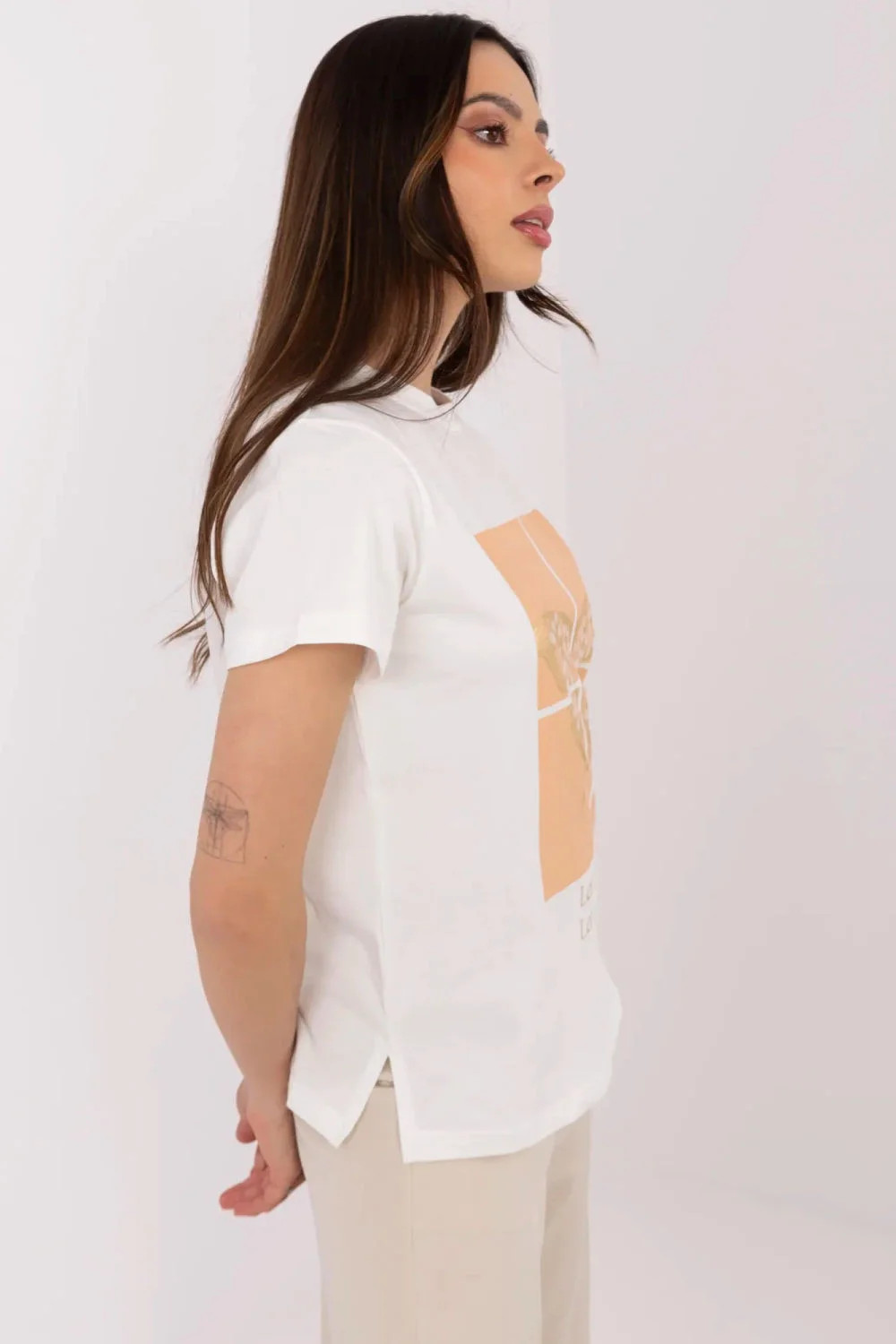 Lehké a pohodlné dámské tričko, ideální na každodenní příležitosti. Vyrobeno z převládající směsi bavlny a elastanu, poskytuje pohodlí a volnost pohybu. Model standardní délky s krátkým rukávem a klasickým kulatým výstřihem skvěle zapadá do každodenního stylu. Tričko zdobí efektní aplikace, flitry ve tvaru motýla, které přitahují pozornost a dodávají celku moderní charakter. Dominantní vzor v kombinaci s decentním potiskem vytváří zajímavý a zároveň univerzální vzhled.