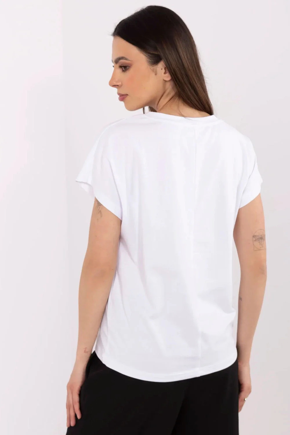 Klasické dámské tričko navržené s ohledem na pohodlí a módní vzhled pro každodenní nošení. Vyrobeno z vysoce kvalitní bavlny s přídavkem elastanu, skvěle padne a poskytuje pohodlí po celý den. Standardní délka, krátký rukáv a klasický kulatý výstřih. Tričko je zdobené efektní aplikací a potiskem, a přídavné ozdoby z cirkonie dodávají celku decentní lesk a elegantní charakter. Ideální volba pro každodenní volné stylizace, které se vyznačují detaily.