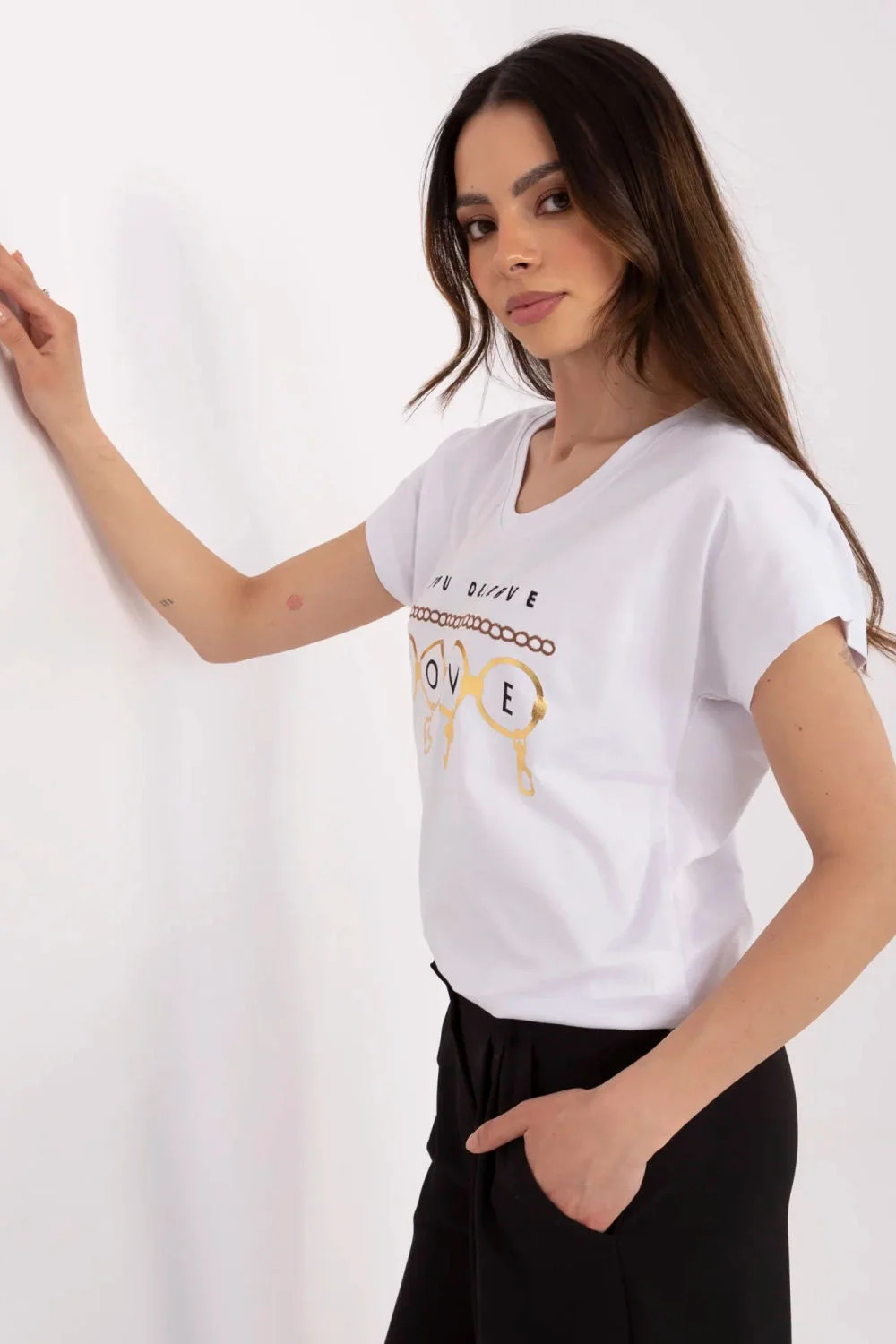 Casual tričko pro ženy ideální na každodenní nošení, kombinující pohodlí s trendy dokončením. Vyrobeno z měkké bavlny s přídavkem elastanu, poskytuje pohodlí nošení a lehké přizpůsobení se postavě. Model standardní délky s krátkým rukávem a ženským výstřihem do V, který krásně zdůrazňuje linii krku. Tričko se vyznačuje efektním spojením potisku a jemné výšivky, vytvářející originální a zároveň stylový detail. Ideální volba pro ženy, které ocení casual styl s nádechem elegance na každý den.