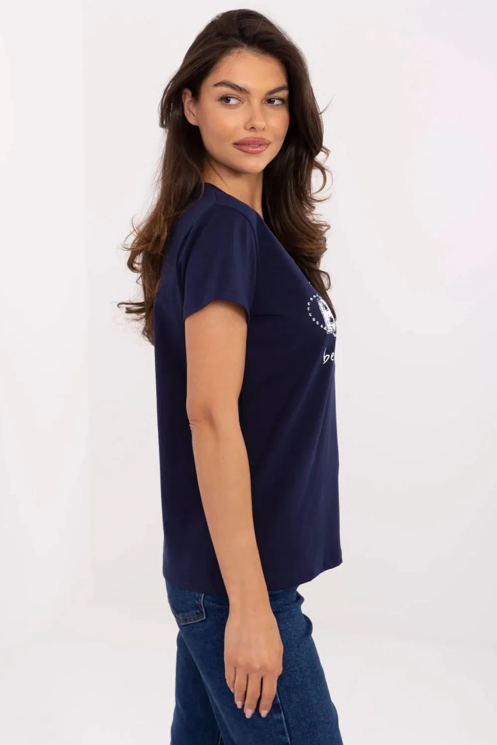 Dámské tričko v casual stylu je ideální volbou pro každodenní outfit s nádechem lesku. Vyrobeno z měkké a elastické směsi bavlny a elastanu, poskytuje pohodlí nošení a skvělé přizpůsobení postavě. Model má standardní délku s krátkým rukávem a ženským výstřihem do šípku. Na přední straně je nápadný potisk s aplikací, zdobený jemnými cirkony, které tričku dodávají výjimečný charakter a jemný lesk. Toto tričko je kombinací pohodlí a stylu, skvělou volbou na každý den, která snadno oživí každý casual outfit.