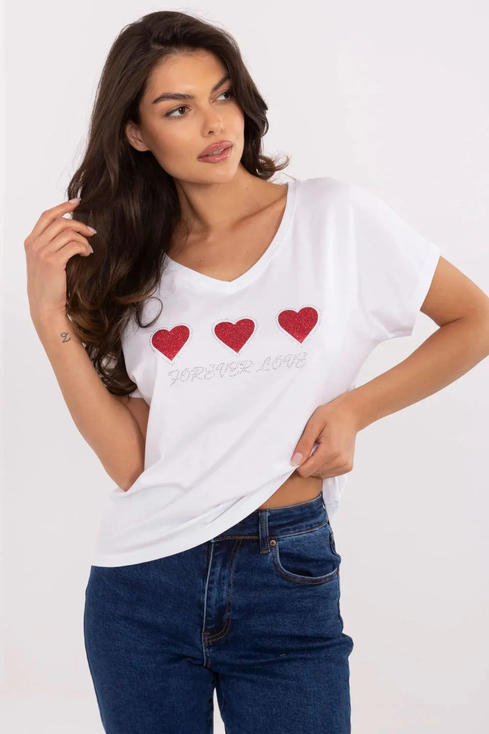 Dámské triko v casual stylu je pohodlnou a stylovou volbou pro každodenní vycházky. Vyrobeno z měkké bavlny s přídavkem elastanu, poskytuje pohodlí a volnost pohybu po celý den. Model má standardní délku, krátký rukáv a klasický kulatý výstřih. Na přední straně je dekorativní aplikace ve tvaru srdcí obklopená třpytivými džetami, které tričku dodávají půvab a jemný lesk. Je to ideální volba pro ženy, které ocení pohodlí s nádechem romantického stylu.