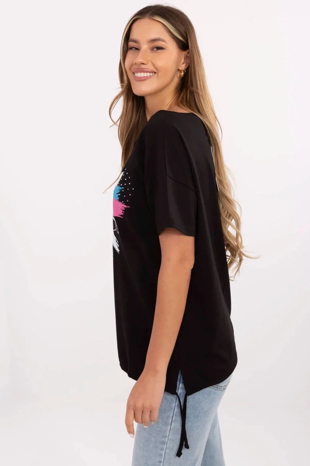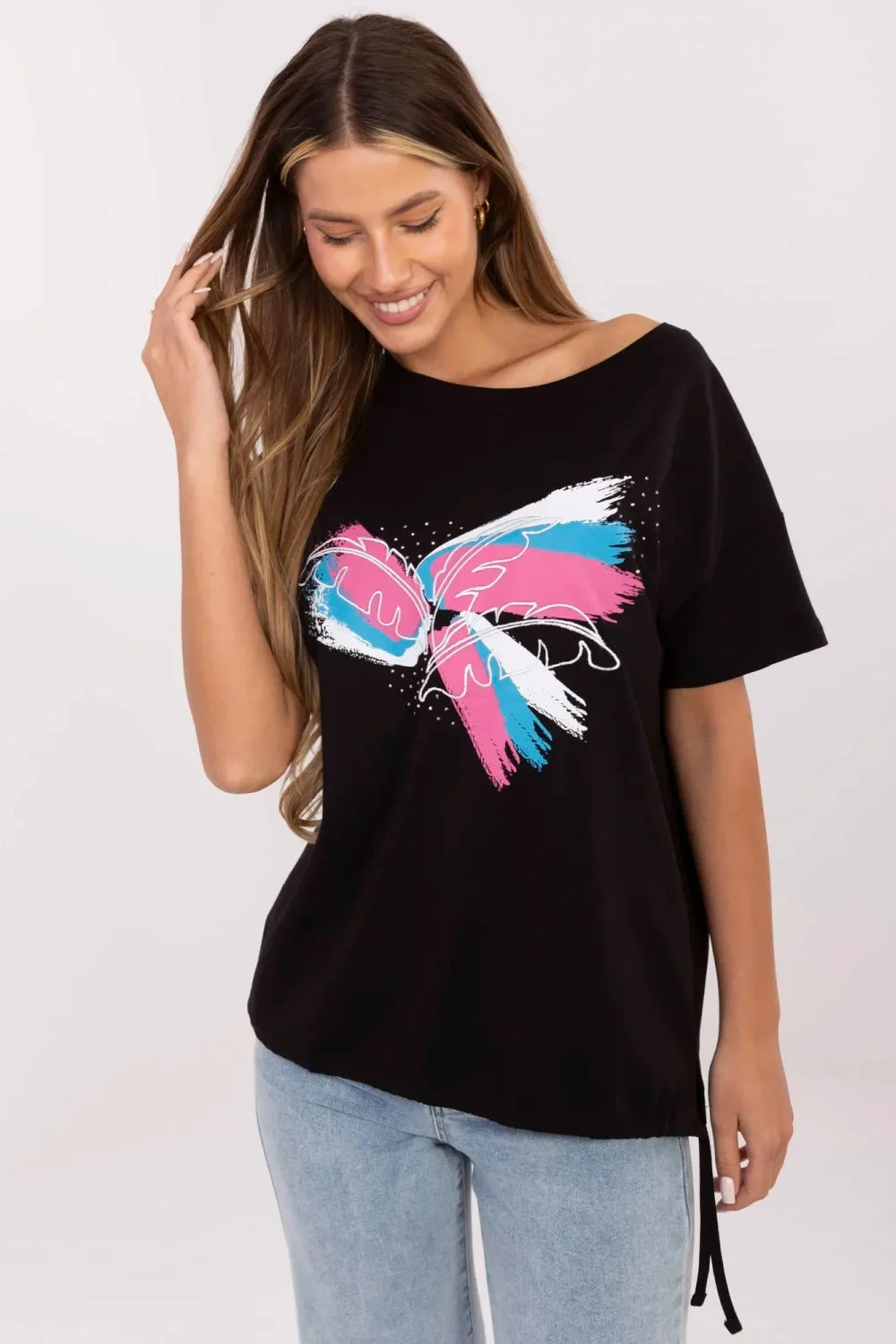 Přidejte trochu lesku do každodenních outfitů s tímto jedinečným dámským tričkem ve stylu casual. Vyrobené z příjemné bavlny s přídavkem elastanu, poskytuje pohodlí a lehké přizpůsobení se postavě. Tričko s klasickou délkou, krátkým rukávem a kulatým výstřihem je ideální pro každodenní nošení, do práce, na procházku nebo setkání s přáteli. Jeho jedinečný charakter zdůrazňuje efektní aplikace na přední straně, kombinující potisk, vyšívání a flitry, což celku dodává moderní a ženský vzhled. Dalším akcentem je šňůrka na levém boku dole, která dodává lehkost a jemnou originalitu. Toto tričko je ideální kombinací pohodlí a stylu, nesmí chybět ve vaší skříni!