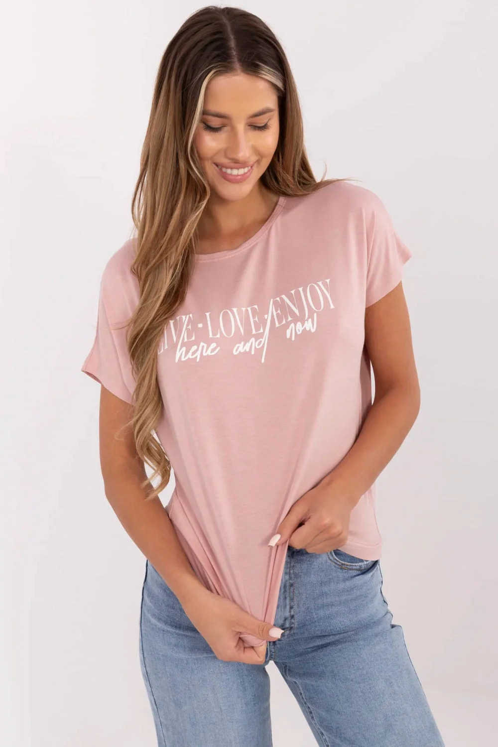 Casual dámské tričko standardní délky je kombinací pohodlí a módního stylu. Vyrobeno z měkké a elastické směsi viskózy a elastanu, zajistí pohodlné padnutí a pohodlí při nošení. Model s krátkým rukávem a klasickým kulatým výstřihem se skvěle hodí do každodenních outfitů. Dominantním prvkem je potisk s nápisy na přední straně, který dodává celku charakter. Skvělá volba na každý den k džínům, legínám nebo sukní.