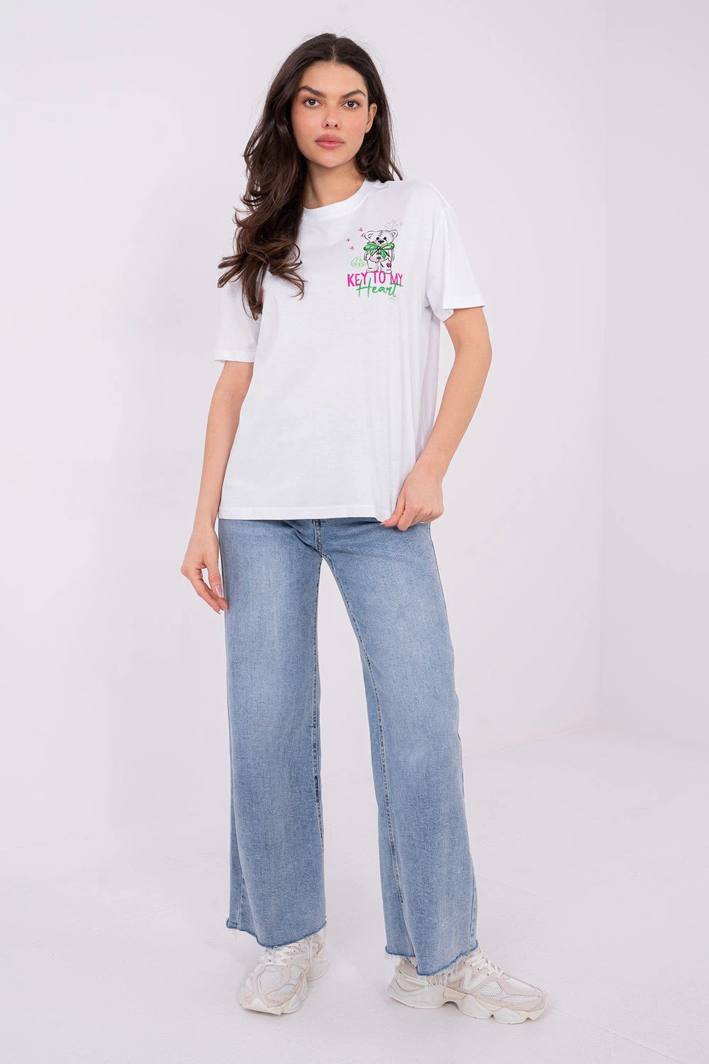 Dámské tričko v casual stylu je pohodlný a módní návrh na každý den. Vyrobeno z 100% měkké bavlny, poskytuje pohodlí nošení, prodyšnost a příjemné přizpůsobení postavě. Hladká základna trička byla oživena potiskem a nápisy, malým detailen vpředu a větším, efektním motivem na zádech, což dává tričku moderní, výrazný charakter. Model standardní délky s krátkým rukávem a klasickým kulatým výstřihem se hodí jak do casual stylizací, tak k vrstvení sako nebo mikina, přidávající styl a lehkost každé denní kreaci.