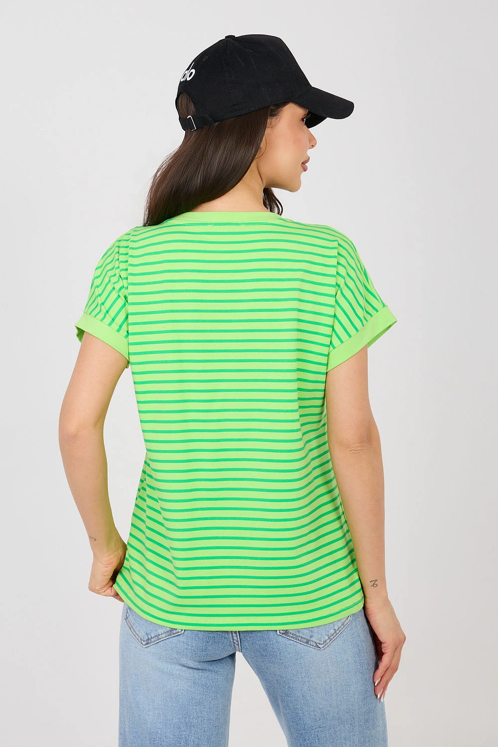 Klasické dámské tričko v casual stylu, ideální na každý den a různé každodenní příležitosti. Model standardní délky má krátký rukáv a kulatý výstřih, který poskytuje pohodlí a volnost pohybu. Dominantním prvkem trička jsou pruhy, které dávají celku moderní a nadčasový charakter. Vyrobený z vysoce kvalitní bavlny s přídavkem elastanu, materiál je měkký, příjemný na dotek a lehce pružný, co zaručuje pohodlí po celý den. Jedná se o univerzální a praktický model, který se snadno kombinuje jak s džíny, sukněmi, tak i kraťasy, vytvářející stylové každodenní sestavy.