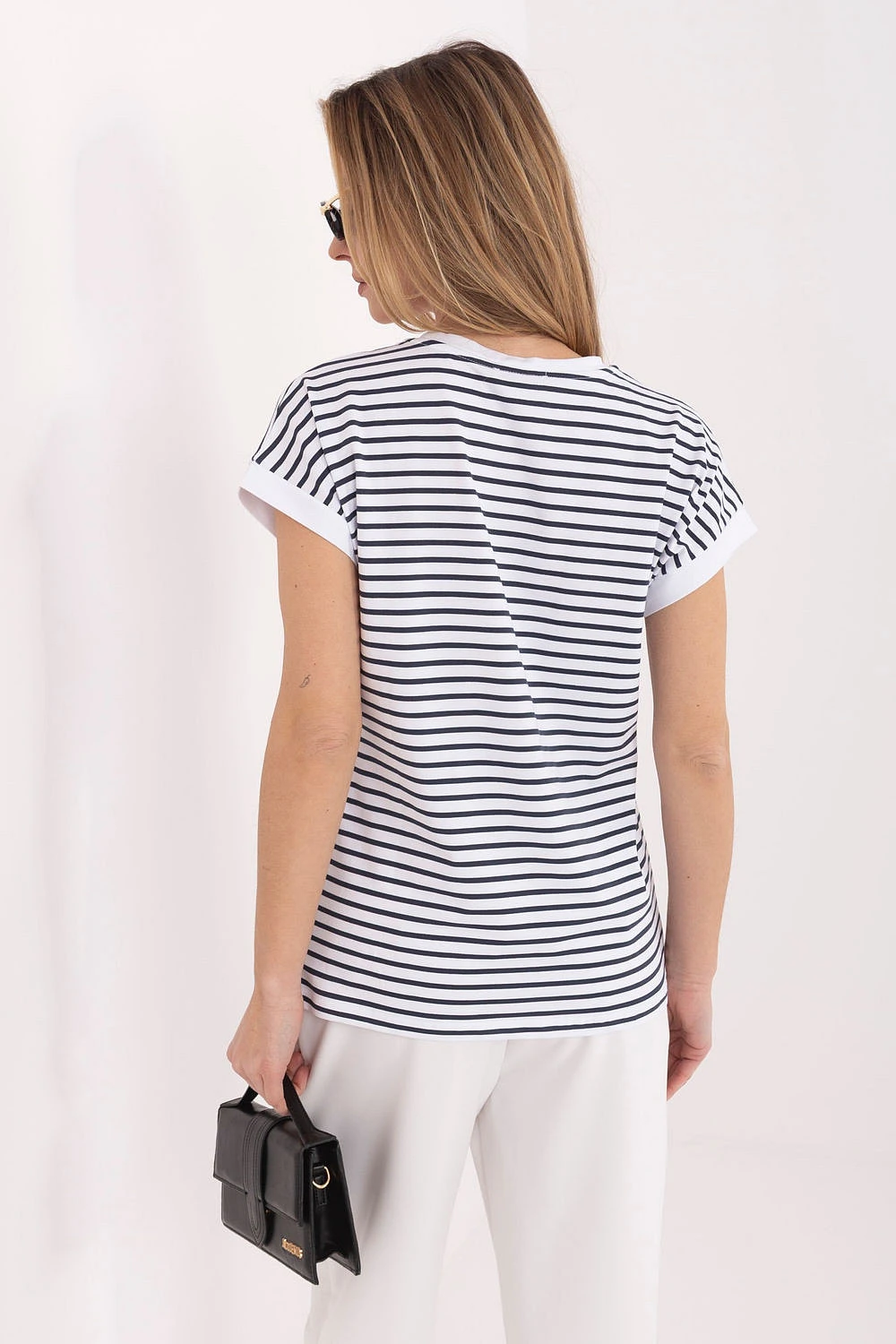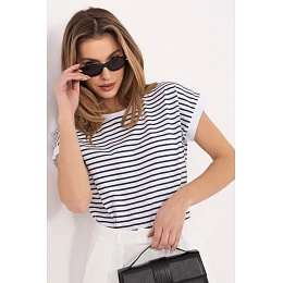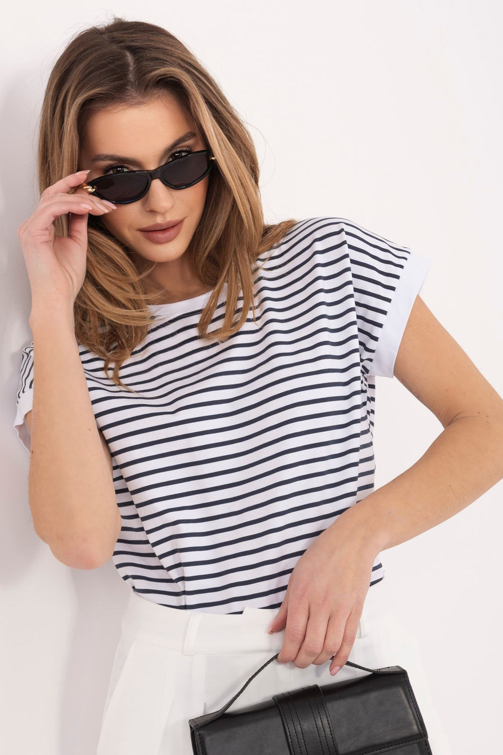 Klasické dámské tričko v casual stylu, ideální na každý den a různé každodenní příležitosti. Model standardní délky má krátký rukáv a kulatý výstřih, který poskytuje pohodlí a volnost pohybu. Dominantním prvkem trička jsou pruhy, které dodávají celku módní a nadčasový charakter. Vyrobeno z vysoce kvalitní bavlny s přídavkem elastanu, materiál je měkký, příjemný na dotek a lehce elastický, co zajišťuje pohodlí při nošení po celý den. Jedná se o univerzální a praktický model, který se snadno kombinuje jak s džíny, sukněmi, tak i kraťasy, vytvářející stylové, každodenní sestavy.