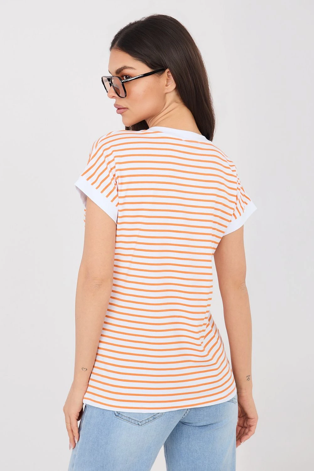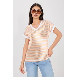 Stylový dámský tričko v casual stylu, ideální na každý den a běžné příležitosti. Model standardní délky má krátký rukáv a výstřih do V, který jemně zdůrazňuje krk a dodává tričku lehce elegantní charakter. Hlavním prvkem designu jsou pruhy, které dávají celku nadčasový a módní vzhled. Vyrobený z vysoce kvalitní bavlny s přídavkem elastanu, materiál je měkký, příjemný na dotek a lehce pružný, co zaručuje pohodlné nošení po celý den. Tričko se skvěle hodí do každodenních stylizací, snadno se kombinuje s džínami, sukněmi nebo kraťasy, vytvářející univerzální a praktický outfit.