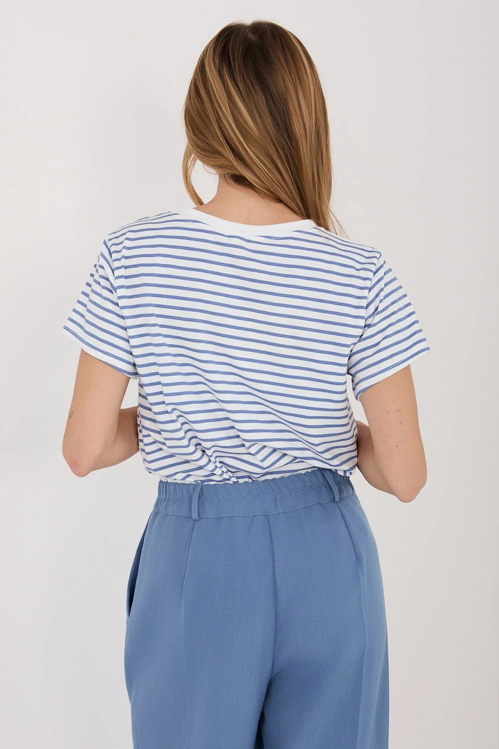 Stylový dámský tričko v nadčasové pruhy, ideální pro každodenní, casual stylizace. Klasický vzor se skvěle hodí jak k džínám, tak k elegantnějším kouskům oblečení. Vyroben z vysoce kvalitní směsi bavlny a elastanu, poskytuje pohodlí, měkkost a dobře padne ke střihu. Standardní délka a krátký rukáv činí tento výběr univerzálním pro každou roční dobu. Model má kulatý výstřih, který zdůrazňuje klasický charakter trička. Celkový dojem doplňuje decentní ozdobný vyšívaný motiv ve tvaru srdce umístěný na levém boku na úrovni prsou, dodávající šarm a ženský akcent.