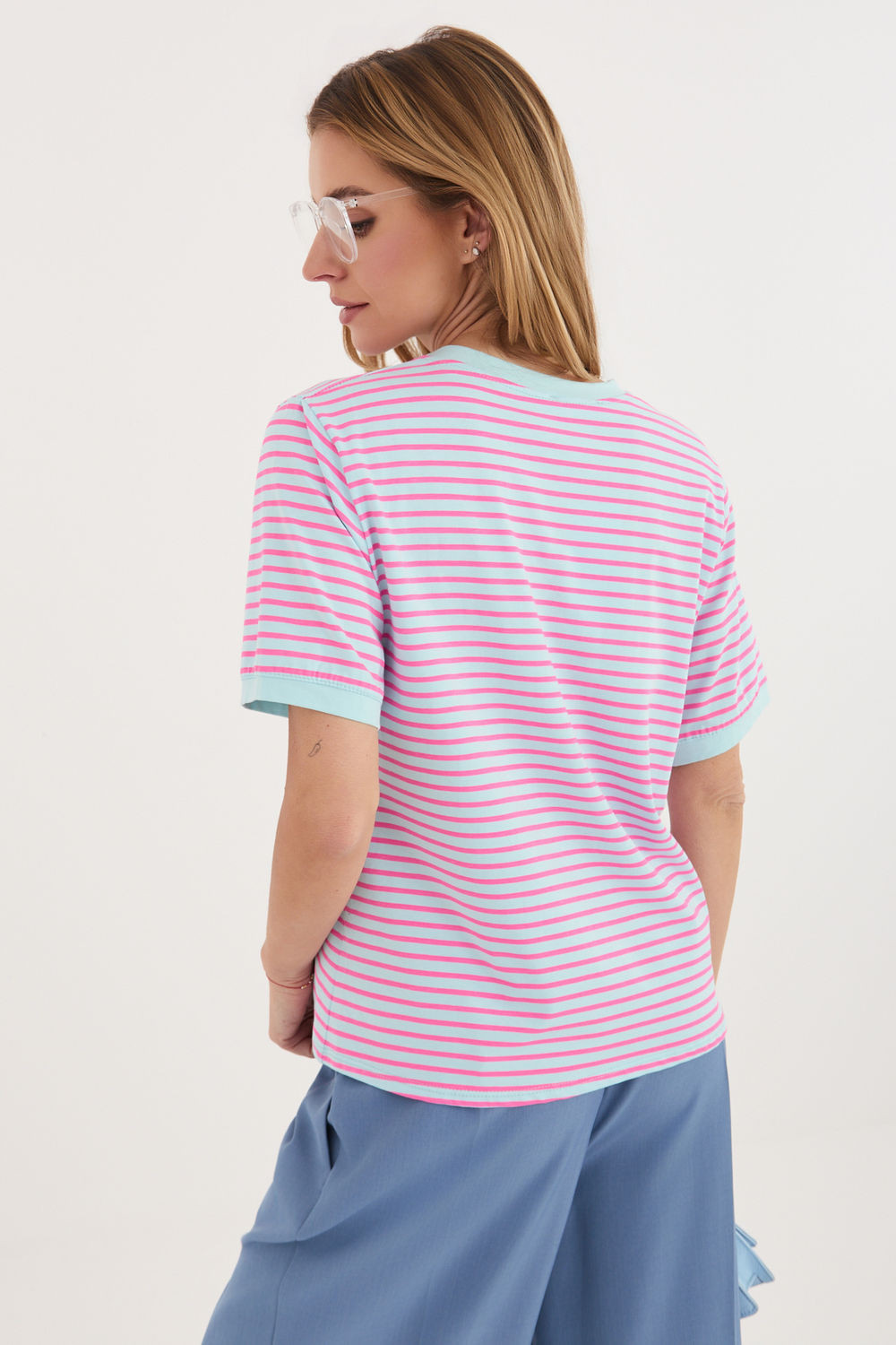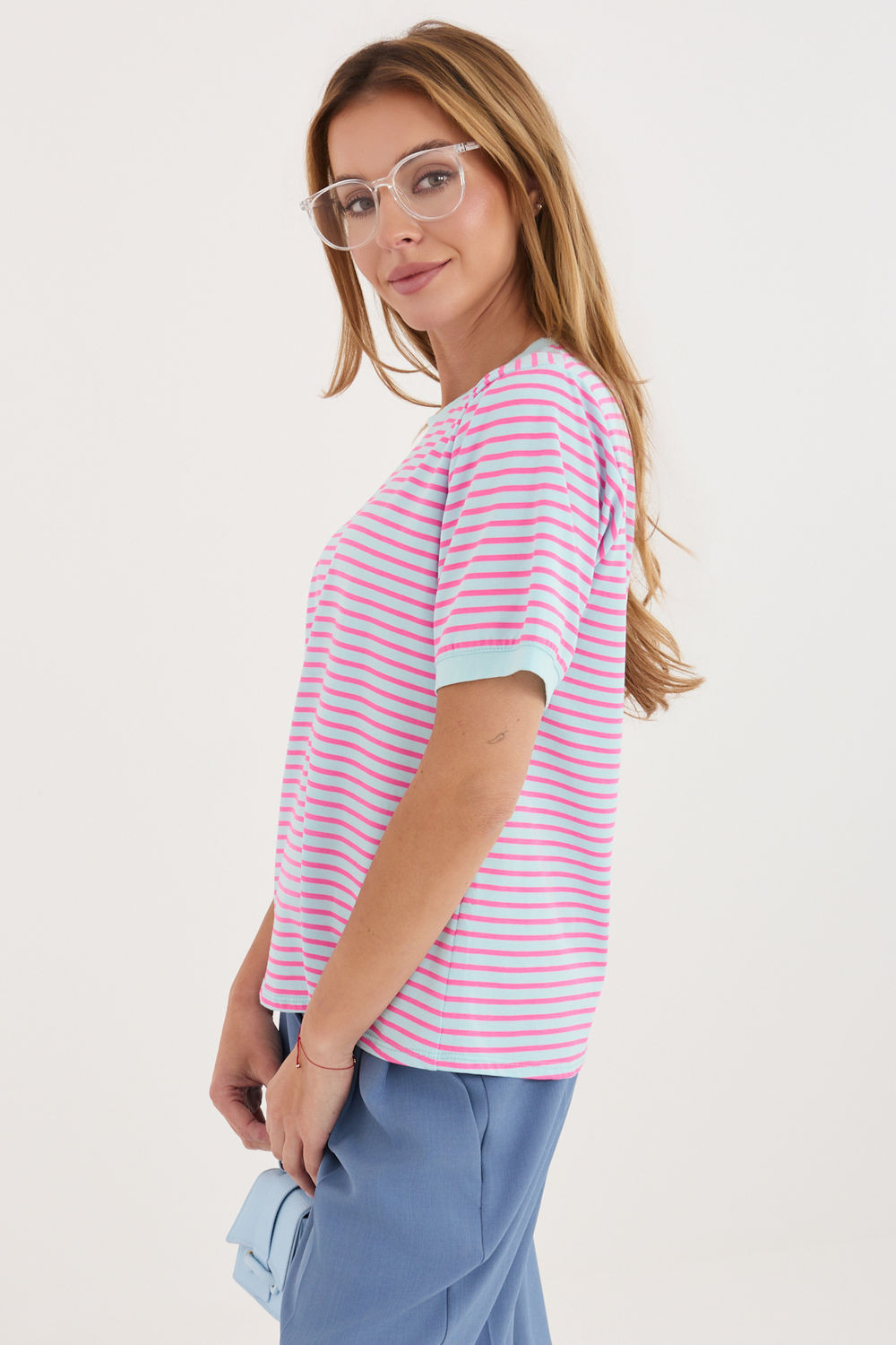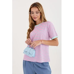 Dámské tričko se pruhy je klasickým návrhem v casual stylu, ideální na každý den. Nadčasový vzor mu dodává univerzální charakter, díky čemuž se skvěle hodí do mnoha stylizací, jak s džíny, tak s sukní nebo šortkami. Model standardní délky s krátkým rukávem a kulatým výstřihem poskytuje pohodlí a volnost pohybu. Vyrobený z měkké, prodyšné bavlny, je příjemný k pokožce a skvěle se osvědčuje při každodenním nošení. Jedná se o základní kousek šatníku, který spojuje pohodlí s jednoduchým, stylovým vzhledem.