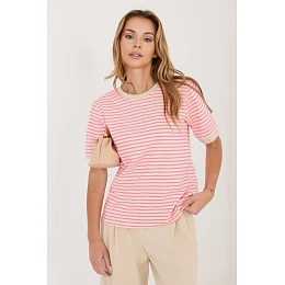 Dámské tričko se proužky je klasickým návrhem v casual stylu, ideální na každý den. Nadčasový vzor mu dodává univerzální charakter, díky čemuž se skvěle hodí do mnoha stylizací, jak s džínami, tak s sukní nebo kraťasy. Model s standardní délkou, krátkým rukávem a kulatým výstřihem poskytuje pohodlí a volnost pohybu. Vyroben z měkké, prodyšné bavlny, je příjemný k pokožce a skvěle se hodí pro každodenní nošení. Jedná se o základní kousek šatníku, který spojuje pohodlí s jednoduchým, stylovým vzhledem.