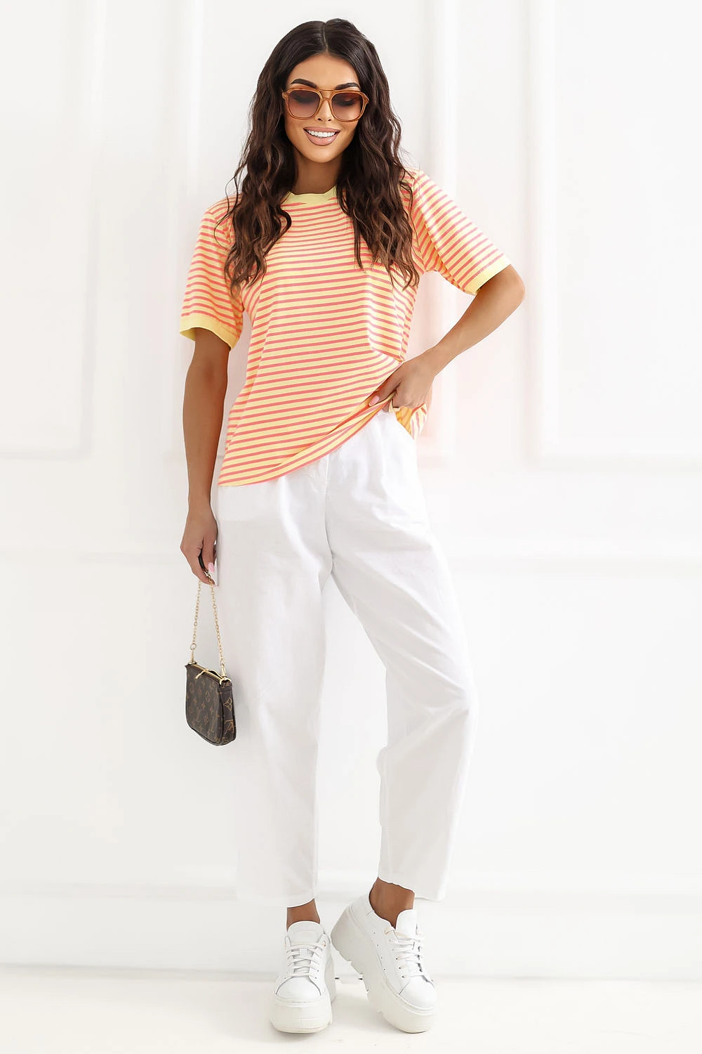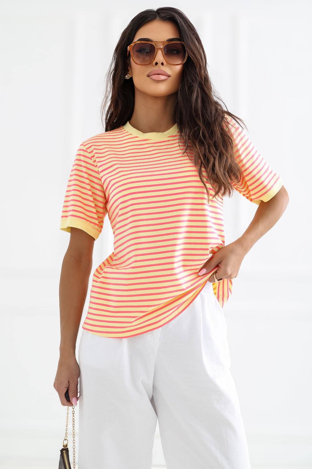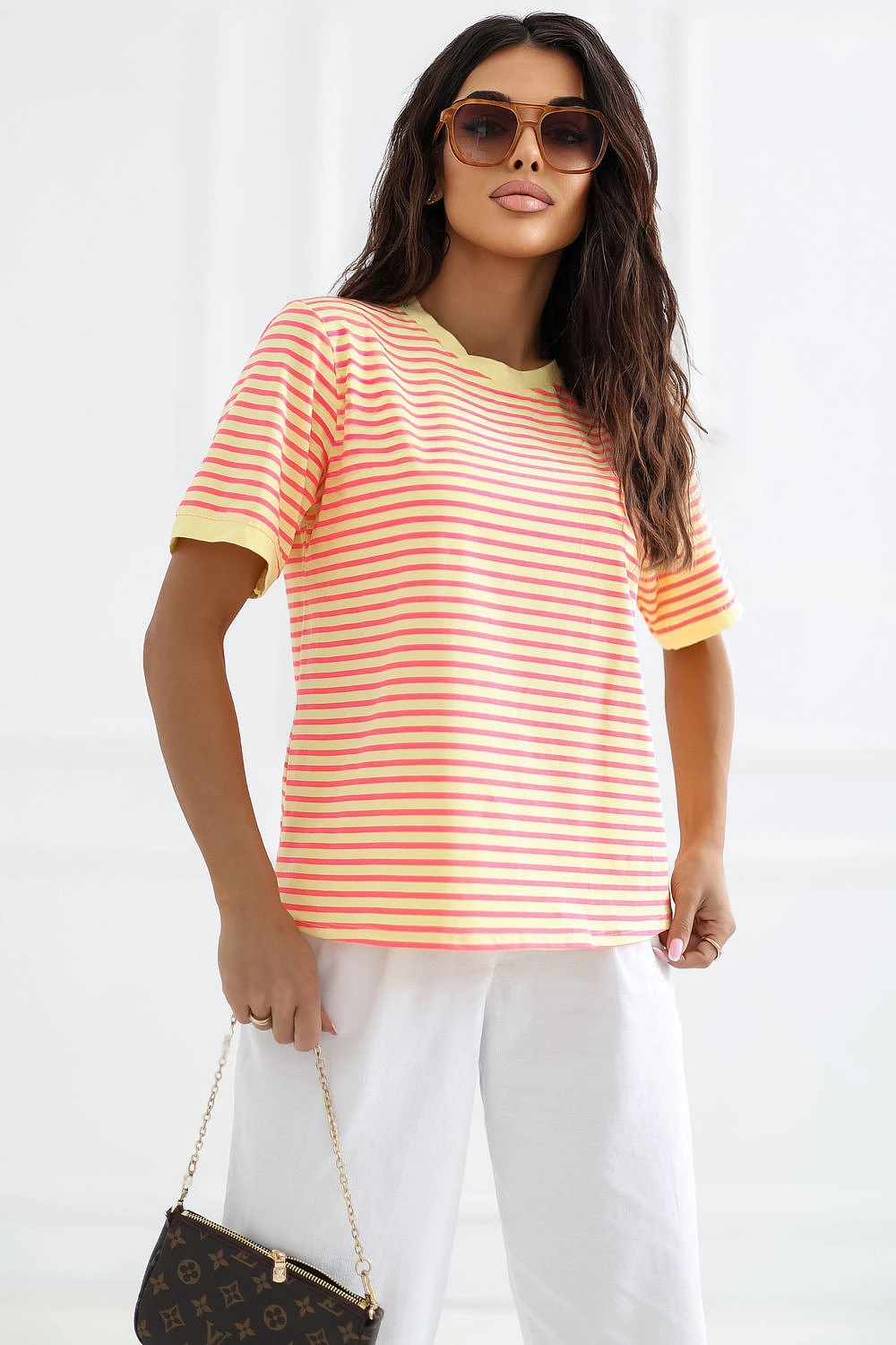 Dámské tričko se pruhy je klasickým návrhem v casual stylu, ideální na každodenní nošení. Nadčasový vzor mu dodává univerzální charakter, díky čemuž se skvěle hodí do mnoha stylizací, jak s džíny, tak s sukní nebo šortkami. Model s standardní délkou, krátkým rukávem a kulatým výstřihem zajistí pohodlí a volnost pohybu. Vyroben z měkké, prodyšné bavlny, je příjemný k pokožce a skvěle se osvědčuje při každodenním nošení. Jedná se o základní kousek do šatníku, který spojuje pohodlí s jednoduchým, stylovým vzhledem.