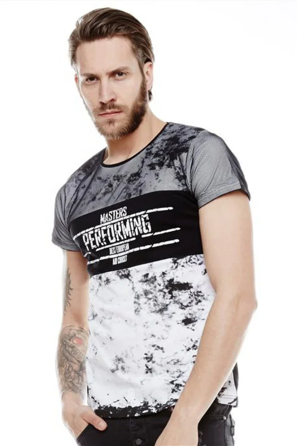 Pánské tričko s krátkým rukávem. Přední strana a rukávy v černé a bílé barvě.