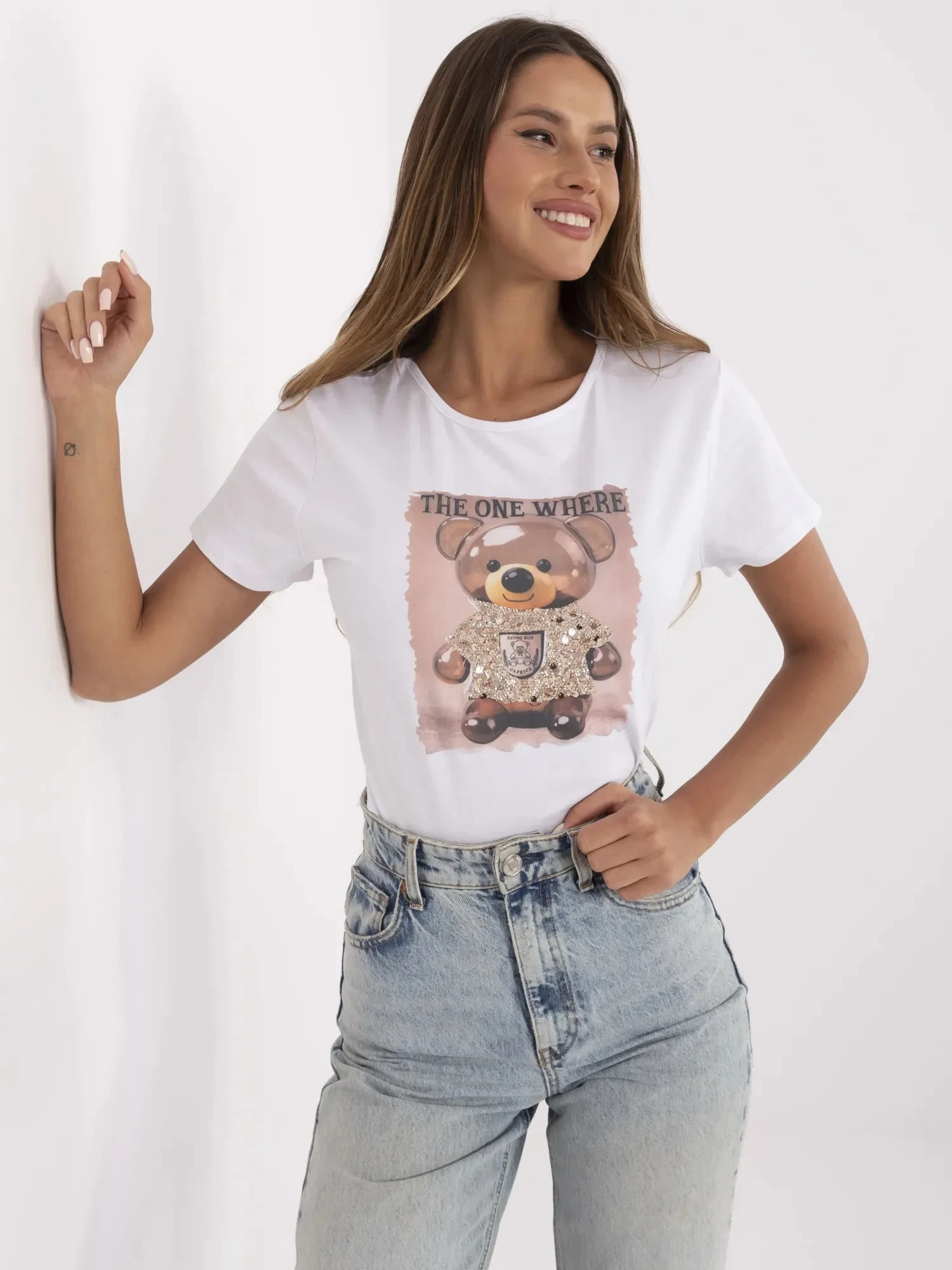 Wymiary t-shirtu w rozmiarze one size mierzone na płasko: szerokość pod pachami - 42 cm, długość rękawa - 16 cm (od szwu), szerokość w biodrach - 42 cm, długość całkowita - 60 cm. (motyw rozciągliwy)