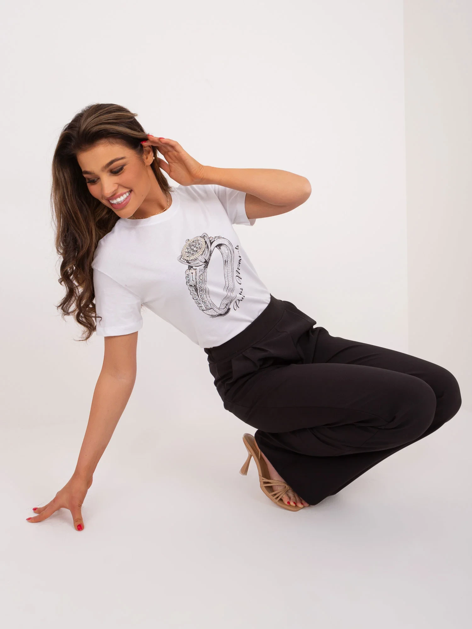 Modelka ma na sobie rozmiar S. Wymiary modelki: wzrost 173 cm, biust 90 cm, talia 64 cm, biodra 91 cm.