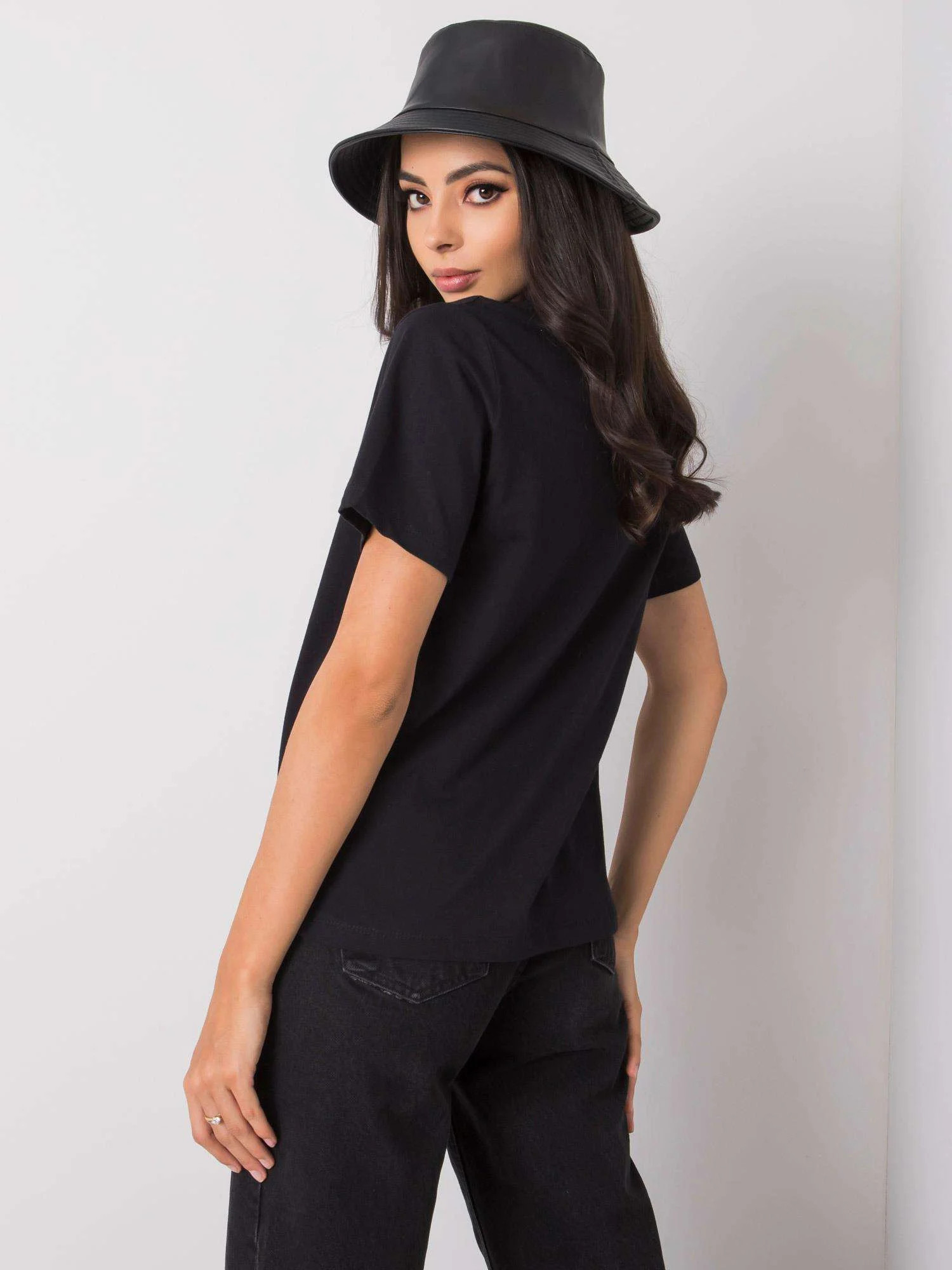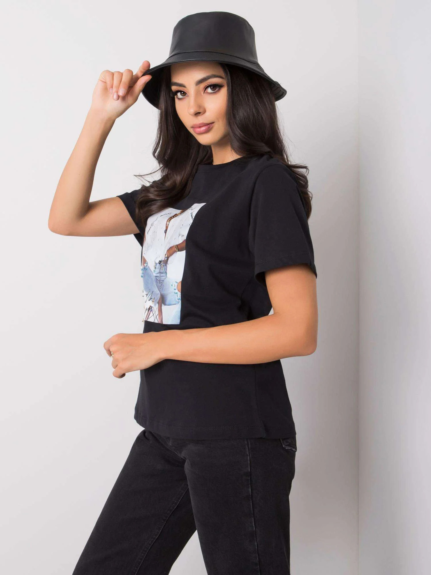 Czarny t-shirt z printem i aplikacją.