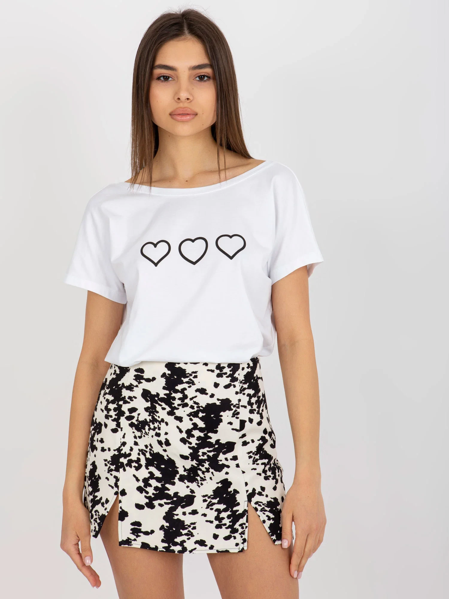 Wymiary t-shirta w rozmiarze S mierzone na płasko: szerokość pod pachami - 54 cm, długość całkowita - 67 cm.
