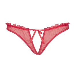 Strohá červená tanga Magenta V-6448 rozpalují smysly pikantním výřezem vpředu a zajímavým vzorem elastických pásků vzadu. Celek je sladkým příslibem rozkoše... zejména v kombinaci s podprsenkou V-6441 a podvazkovým pásem V-6442.