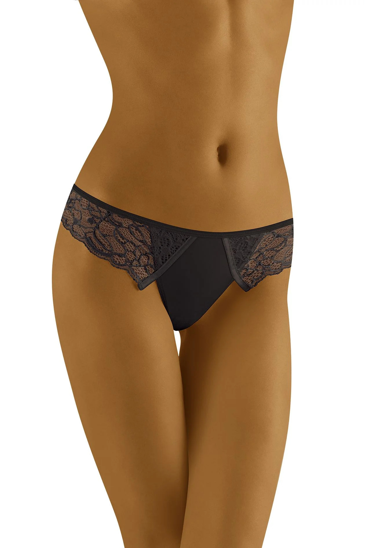 Sexy tanga s mašličkou nad hýžděmi a krajkovou "zástěrkou" kolem boků. Díky nízkému střihu působí celek velmi smyslně. 87 % polyamid, 13 % elastan.