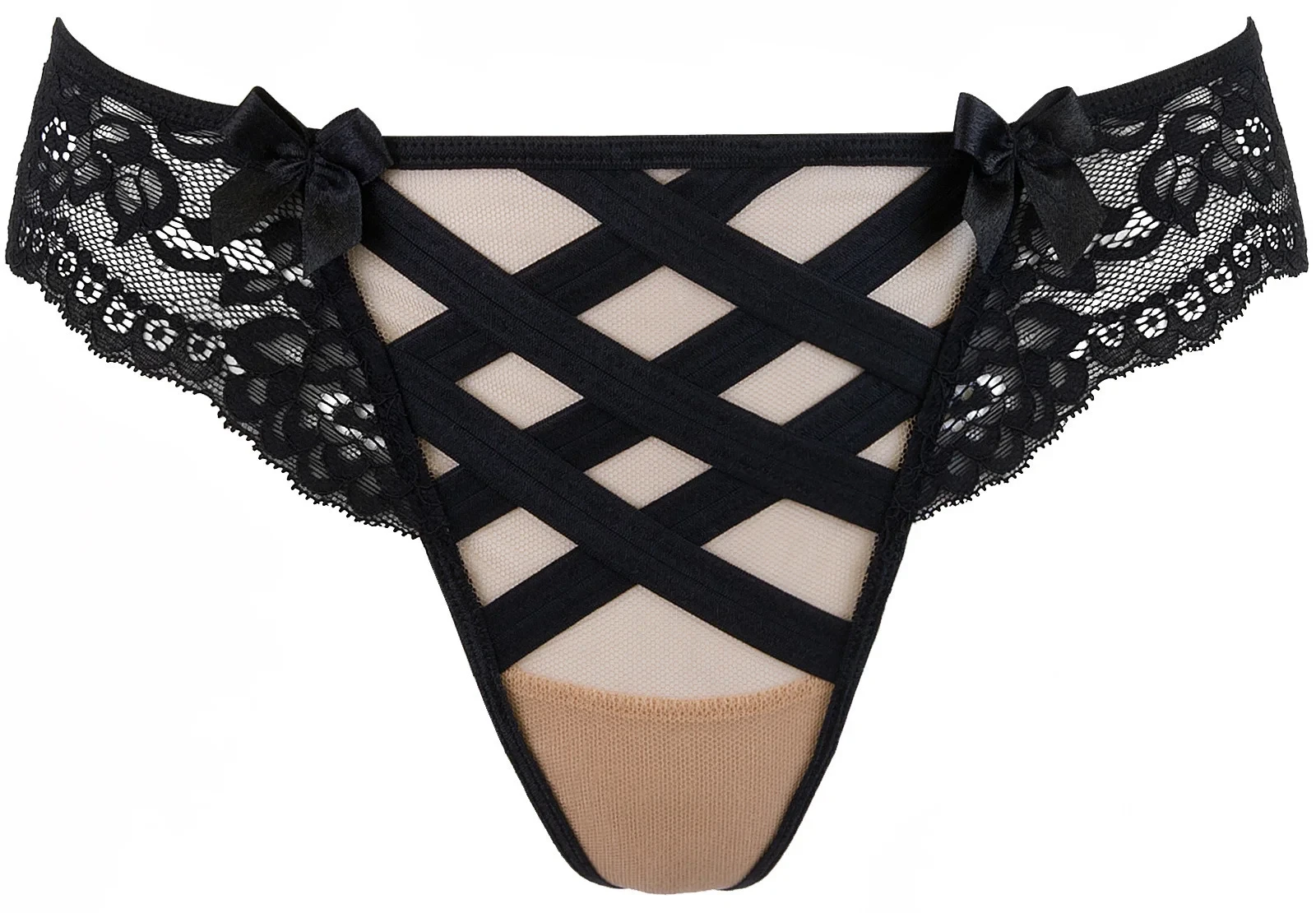 Černo-béžová tanga s propletenými pásky jsou neokázalým a efektním doplňkem zdobeným malými mašličkami po stranách, s motivem kříže na zádech, tak módním a elegantním. Tanga mají pohodlnou měkkou a pružnou krajku a bavlněný klín, takže se příjemně nosí.