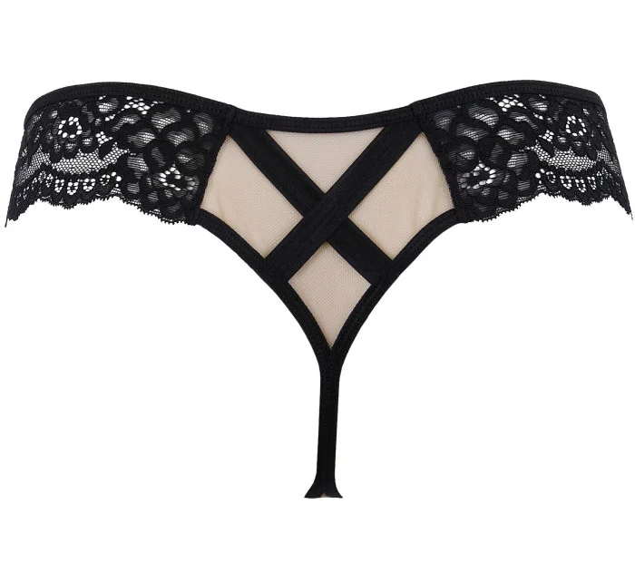 Černobéžová tanga s propletenými proužky jsou neobyčejným a efektním doplňkem zdobeným malými mašličkami na bocích, také s módním a stylovým motivem kříže na zadní straně. Tanga mají příjemnou měkkou a pružnou krajku a bavlněný klín, díky kterému je příjemné je nosit. Materiálové složení: polyamid 75 %, elastan 11 %, bavlna 7 %, polyester 7 %