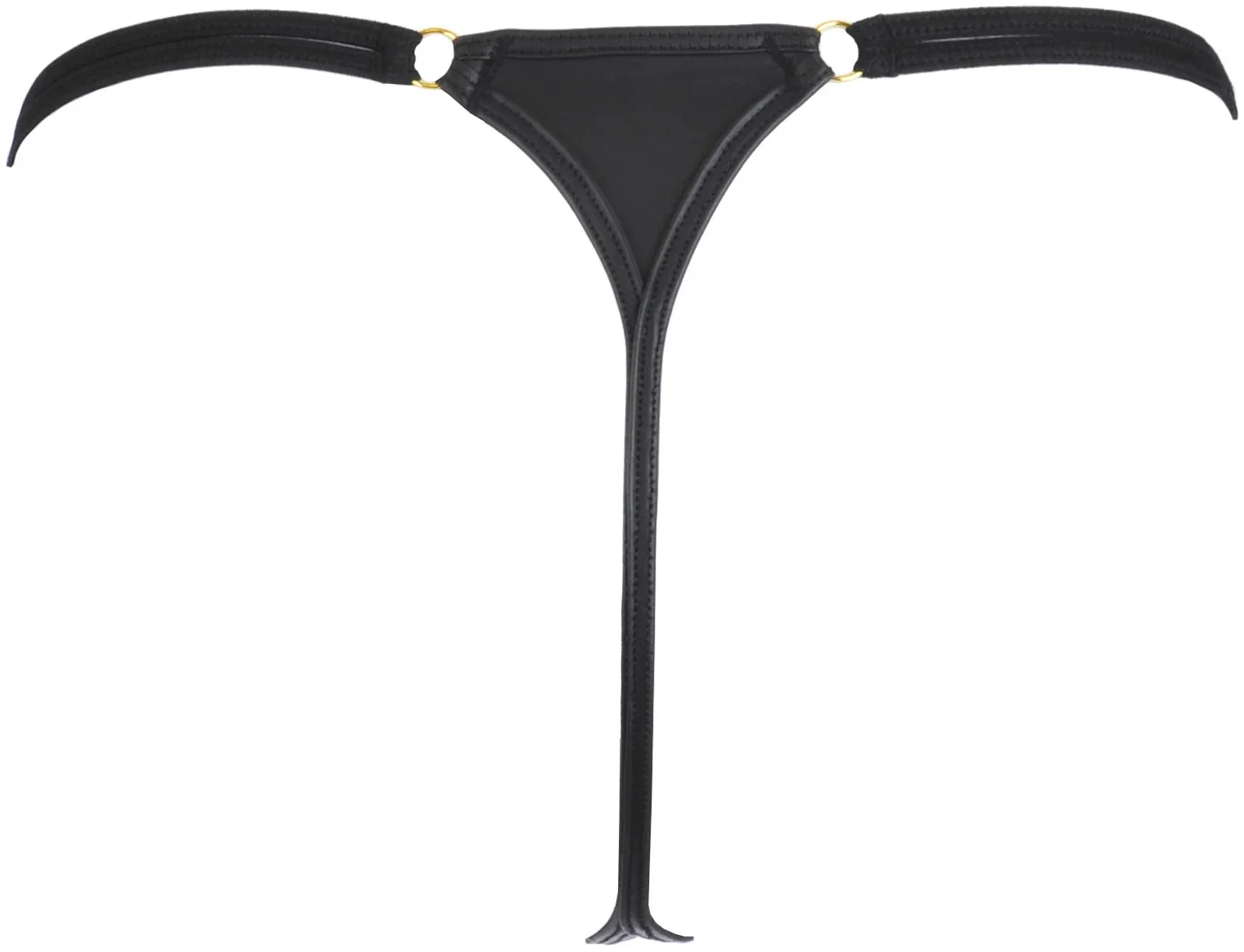 Neuvěřitelně pikantní a sexy tanga s otevřeným zipem, který rozvíjí fantazii. V pase jsou zabudované kovové kroužky zlaté barvy, které spojují dvojité popruhy. Vestavěný pohodlný bavlněný klín. Model z černého měkkého latexu.