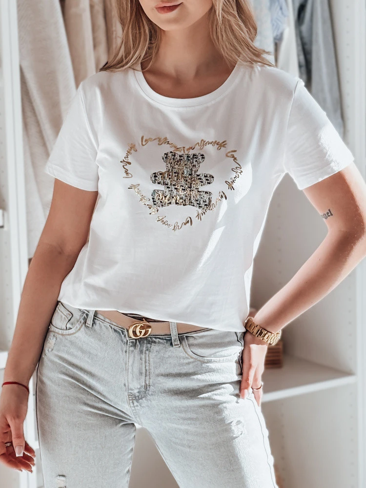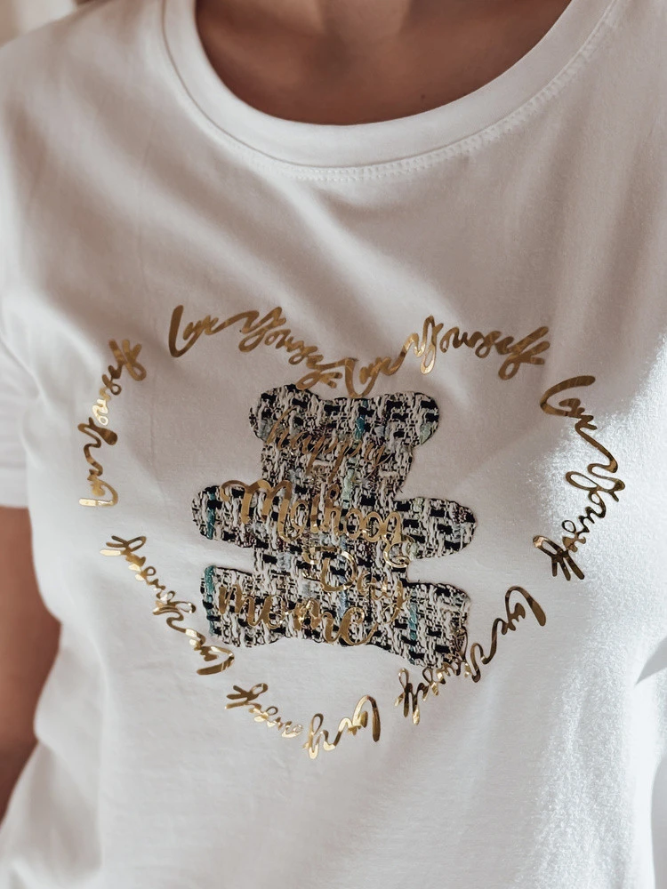 Dámské tričko volného střihu, ideální pro každodenní stylizaci, se stylovým potiskem medvídka a zlatým nápisem pro jedinečný nádech. Pohodlný střih poskytuje volnost pohybu a klasický střih se dobře kombinuje s džínami nebo sukní. Skvělá volba pro každodenní nošení i běžné vycházky.