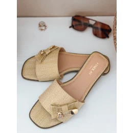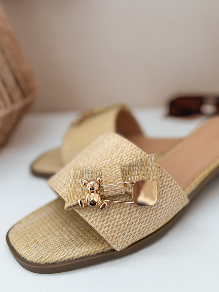 Dámské letní žabky s ozdobnou mašlí a decentním motivem medvídka jsou módní volbou pro teplejší dny. Pohodlná plochá podrážka a struktura z přírodního materiálu podtrhují prázdninový charakter obuvi. Ideální na pláž, procházky i městské stylizace.