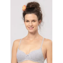 Ten klasyczny biustonosz wykonany z miękkiej, oddychającej dzianiny bawełnianej to doskonały wybór na co dzień. Delikatnie usztywniane miseczki kształtują biust, jednocześnie nie dodając nadmiernej objętości. Regulowane, cienkie ramiączka pozwalają idealnie dopasować model do sylwetki, a subtelna kokardka między miseczkami dodaje mu dziewczęcego uroku. Gładka tkanina sprawia, że biustonosz pozostaje niewidoczny pod ubraniem, gwarantując swobodę i pełen komfort nawet przy długim noszeniu.