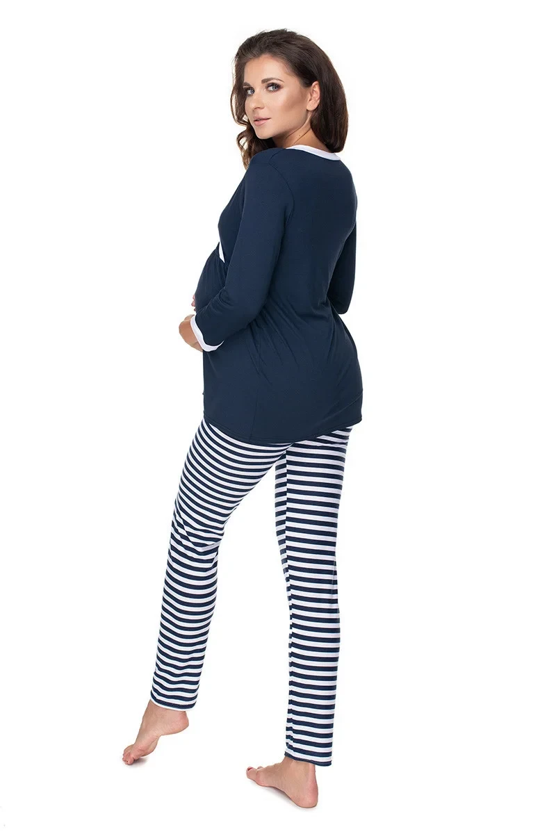 Těhotenské pyžamo v tmavě modré barvě. Halenka vhodná pro kojení. Legíny s netlačícím panelem. Lze nosit i po těhotenství.