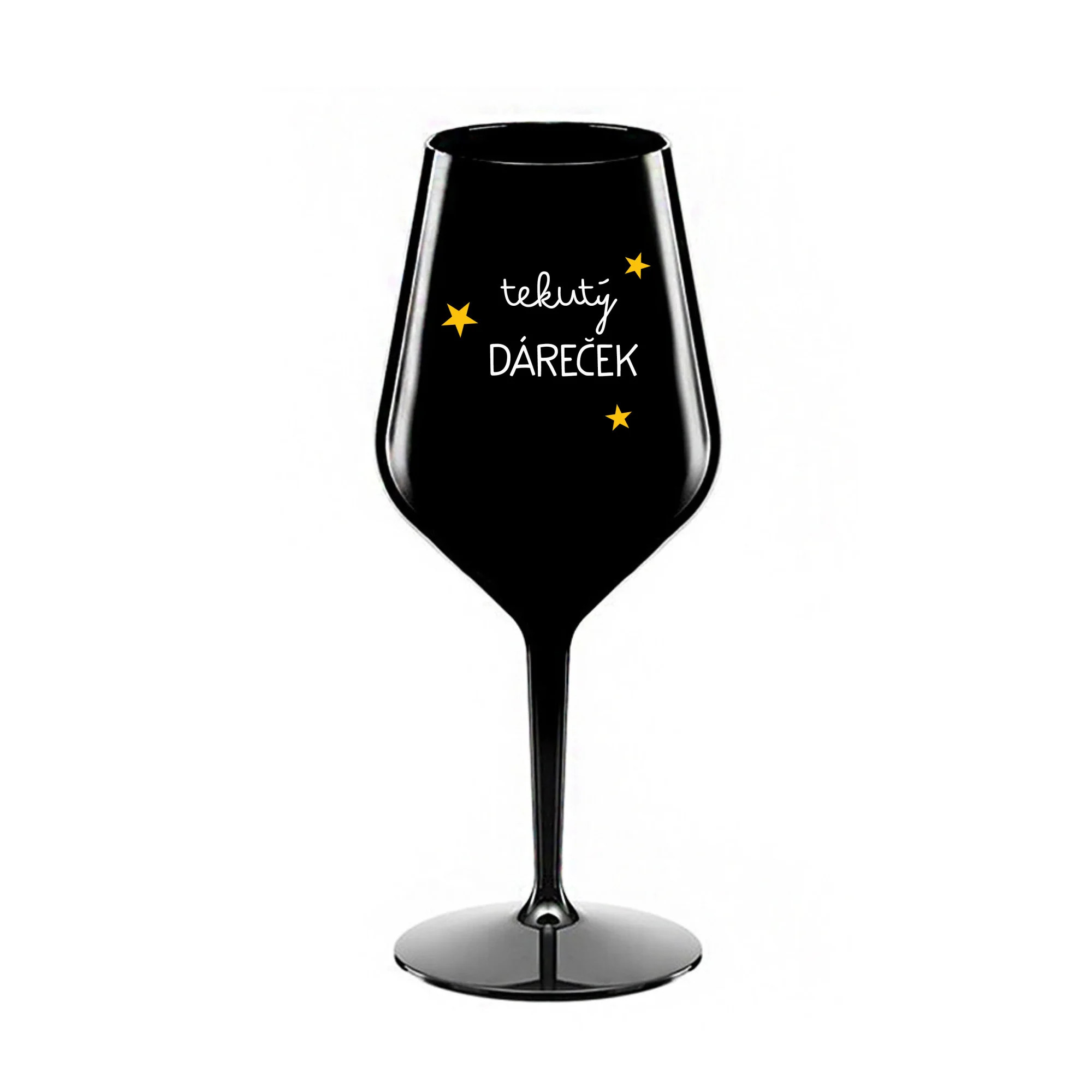 Nerozbitná černá vinná sklenice s motivem TEKUTÝ DÁREČEK je skvělá na zahradu, pláž, výlet, piknik a parádu udělá i při kempování. Jelikož je vyrobená z kvalitního polykarbonátu je de facto nerozbitná. Je to luxusní kousek, s nímž si víno můžete vychutnat prostě kdekoliv. Mají ergonomický tvar, který příjemně padne do ruky a protože je lehká, usnadňuje to její přenášení. Je snadno skladovatelná a lehce se čistí. Díky svému designu si s ní můžete vychutnat doopravdy kdekoliv bezproblémové pití výborného vína. Materiál PP. Vyrobené s láskou v ČR