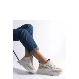 Elegantní dámské tenisky Milenka v béžovo-zlaté barvě jsou ideální obuví na každý den. Vyrobené z vysoce kvalitních materiálů poskytují pohodlí a pohodlí každým krokem. Zlaté detaily jim dodávají styl a eleganci, čímž se stanou skvělým doplňkem mnoha stylizací. Zapínání na tkaničky zajistí ideální přizpůsobení noze. Tenisky mají nízký svršek a podrážku vyrobenou z odolné gumy ve bílé barvě. Ideální na procházku, do práce nebo na setkání s přáteli. Výška podpatku 5,5 cm