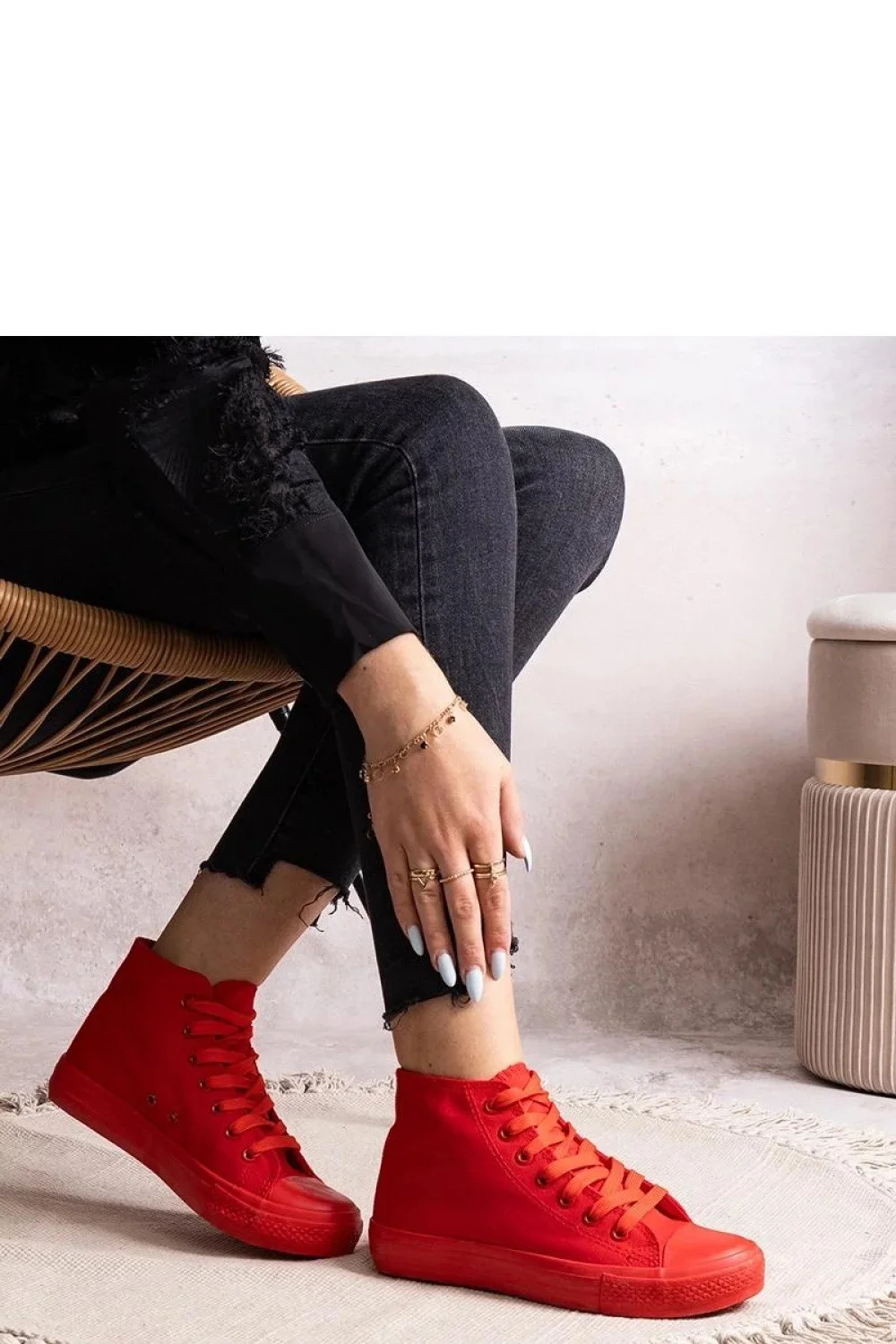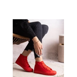 Červené vysoké tenisky Rafife jsou obuv, která určitě upoutá pozornost svým stylovým designem. Jejich šněrovací uzavření zajišťuje ideální přizpůsobení noze a vysoký svršek jim dodává charakter. Pohodlí nošení zaručuje kulatá špička a stabilní gumová podešev. Skvěle propracovaný střih z nich činí skvělé doplnění každého outfitu. Ideální na jaro a léto. Vnější materiál je odolná tkanina a červená barva podešve jim dodá trochu odvahy a charakteru.