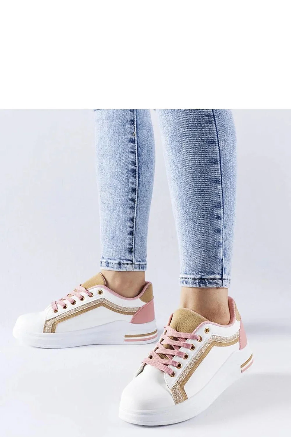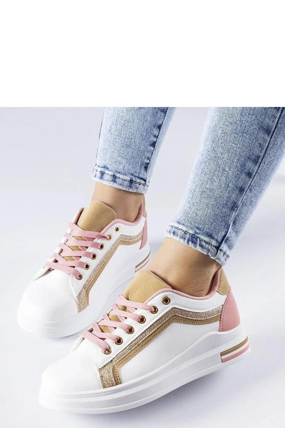 Stylové bílo-růžové tenisky na platformě Mayfield vyrobené z vysoce kvalitní ekologické kůže. Tenisky jsou zdobené zlatými prvky, které jim dodávají eleganci a styl. Mají šněrovací uzavírání, které zajišťuje ideální přizpůsobení noze. Ideální na léto díky bílé podrážce a lehké konstrukci. Přidají charakter každému outfitu, jak casualovému, tak elegantnějšímu. Must-have pro každou módní ženu!
