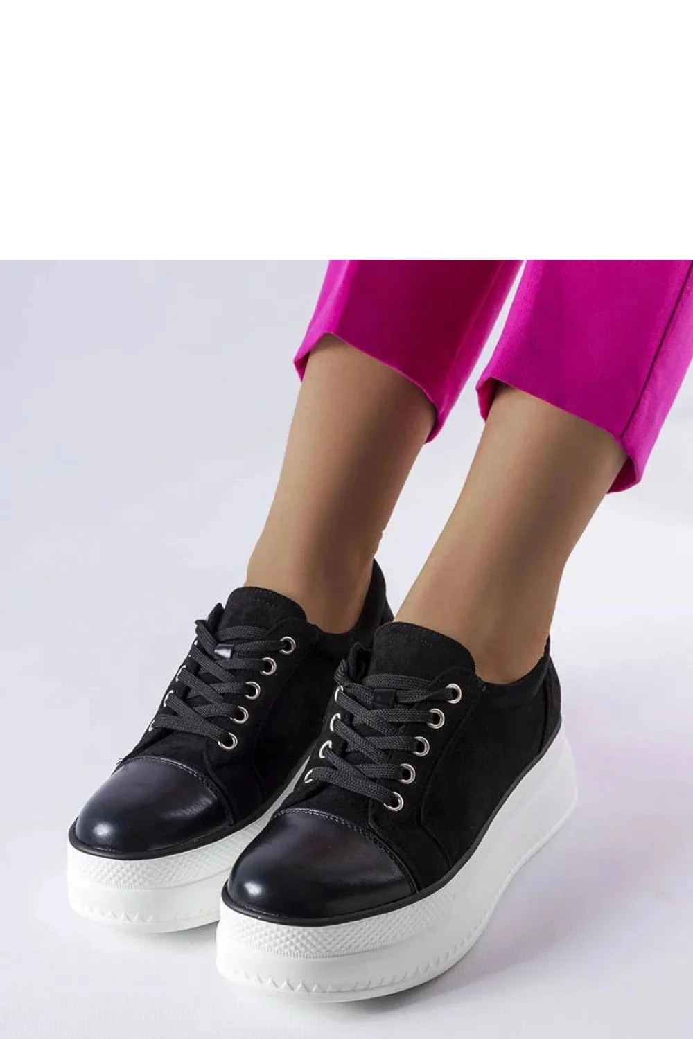 Černé tenisky na platformě Pascaline jsou ideální volbou pro milovnice streetwearového stylu s nádechem elegance. Vyrobené z vysoce kvalitní ekologické semišové kůže s lakovaným špičkou, tyto boty vám poskytnou nejen módní vzhled, ale také pohodlí nošení. S plochými tkaničkami a pohodlnou textilní vložkou vám zajistí pohodlí na každém kroku. Kotník dosahující ozdobenými jemnými stehy přidává botám charakter a tlustá podešev zdobená svislými drážkami jim dodává unikátní vzhled. Bílá podešev kontrastuje s černým svrškem, dodávají botám čerstvost a modernost. Tyto tenisky skvěle ladí s moderními džíny a oversized mikinou, vytvářejíce stylový outfit ideální na každý den. Velikost je standardní, takže si můžete bez obav vybrat svou velikost. Užijte si módní vzhled a pohodlí nošení díky teniskám Pascaline na platformě!