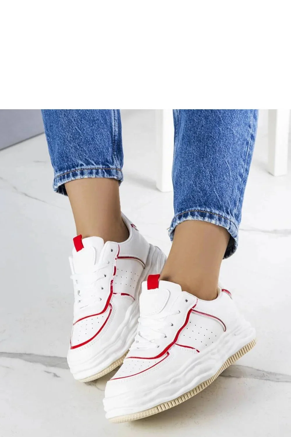 Bílé tenisky s červenými vložkami Nettie jsou ideální obuví na léto. Mají klasický design, který dodává styl každému casual outfitu. Tenisky mají šněrování, co zajišťuje ideální přizpůsobení noze. Vyrobené z vysoce kvalitních materiálů, poskytují pohodlí při nošení. Bílá gumová podrážka dodává lehkost a zajišťuje, že boty jsou pohodlné k nošení. Ideální na letní procházky nebo setkání s přáteli. Přidejte trochu barvy do svého šatníku díky teniskám Nettie!