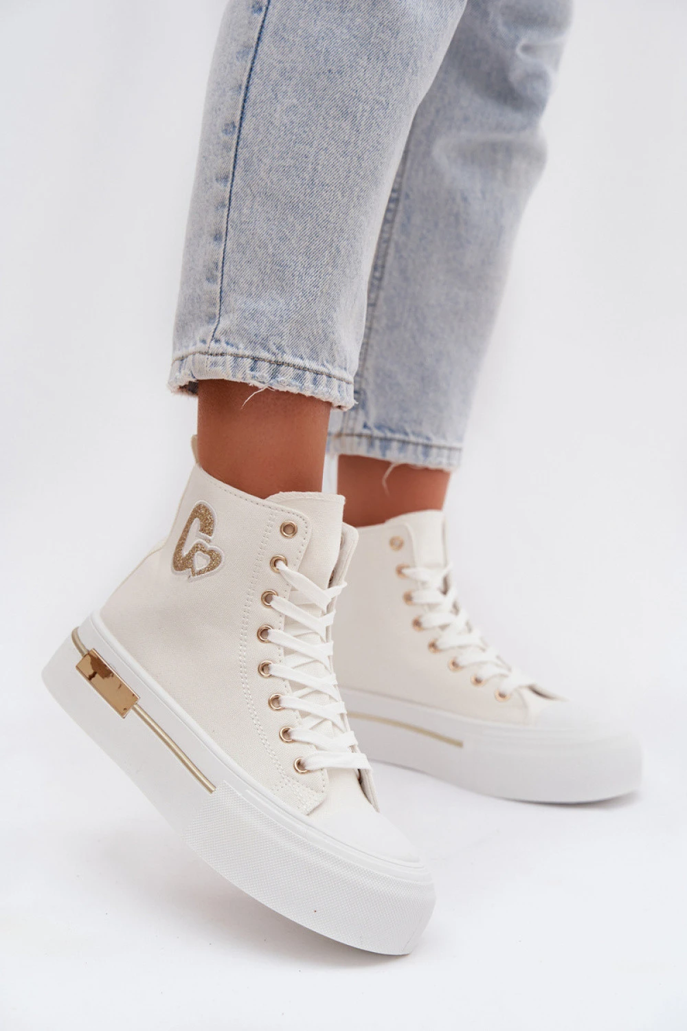 Tenisky s masivní platformou jsou stylovým návrhem pro každý den. Tlustá platforma poskytuje pohodlí a stabilitu, zlatý prvek umístěný na platformě dodává celku elegantní akcent. Na straně je ozdobná nášivka, která zdůrazňuje módní charakter modelu.