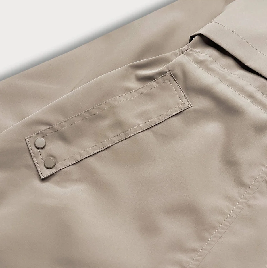 Bunda má dvě kapsy bez zapínání a zapíná se zipem a panelem s patentkami. Model má kapuci, kterou není možné odepnout. Na koncích rukávů jsou manžety. Bunda má délku k bokům a v pase má uvnitř stahující šňůrku.