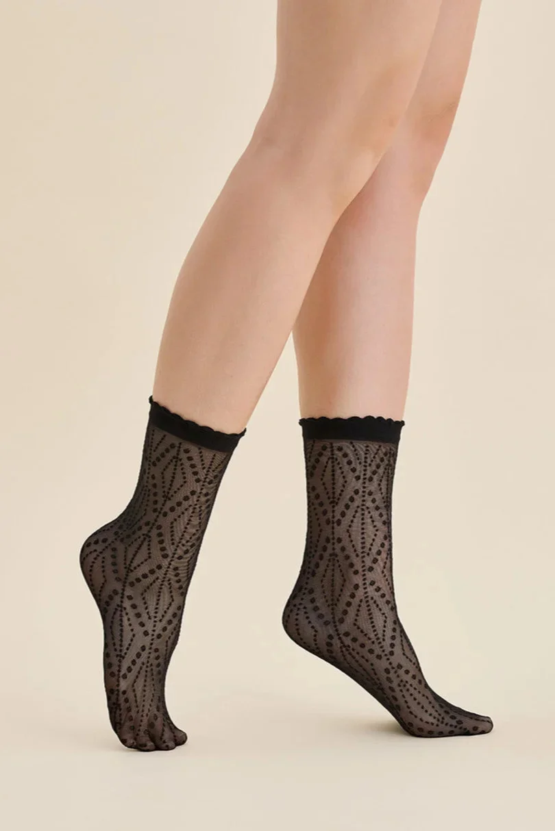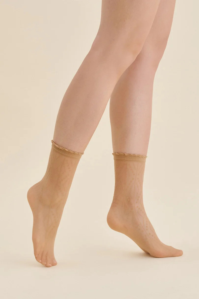 Ponožky LOMA jsou skutečným skvostem ve světě módních doplňků! Dámské punčochové ponožky s výrazným geometrickým vzorem s kosočtverci a tečkami dodají jedinečný charakter každému outfitu. Tmavší odstín vzoru krásně kontrastuje s pozadím, přitahuje pohledy a dodává nonšalantnost každodennímu i večernímu vzhledu. Elastický, ozdobný lem s volánkem nejenže vypadá efektně, ale také zaručuje pohodlí a dokonalé přizpůsobení - bez jakéhokoli tlaku. Díky ponožkám Loma bez vyznačené paty a špičky se hodí ke každému typu obuvi, od balerínek až po elegantní lodičky.