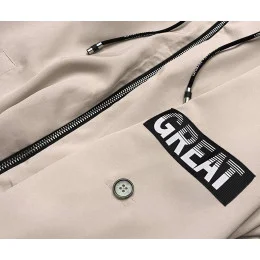Přehoz se zapíná zipem a má dvě kapsy bez zapínání. Vzadu je v pase guma. Rukávy je možné ohrnout. Přední část modelu má délku k bokům a zadní část má délku do poloviny stehen.