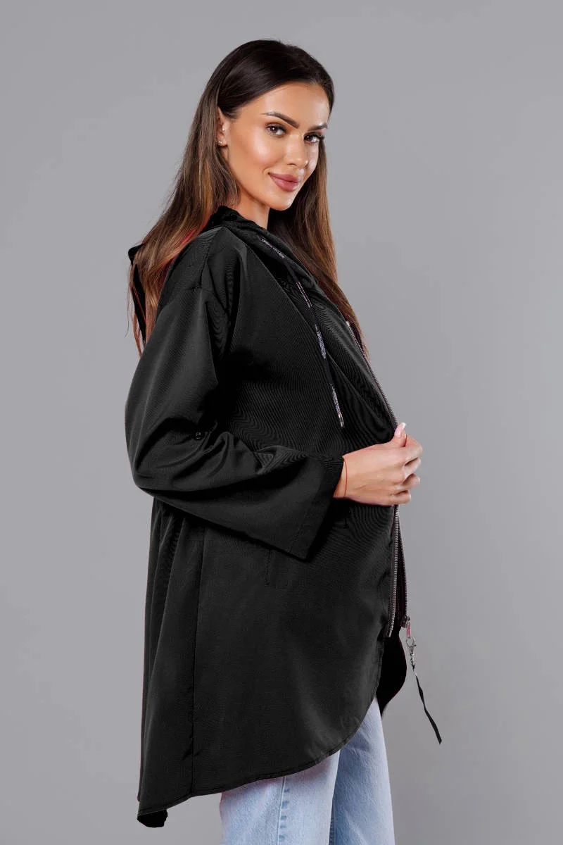 Přehoz se zapíná zipem a má dvě kapsy bez zapínání. Vzadu je v pase guma. Rukávy je možné ohrnout. Přední část modelu má délku k bokům a zadní část má délku do poloviny stehen.