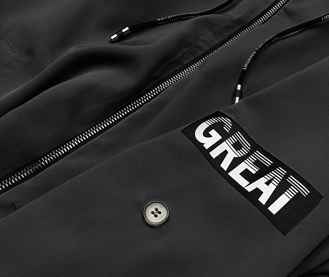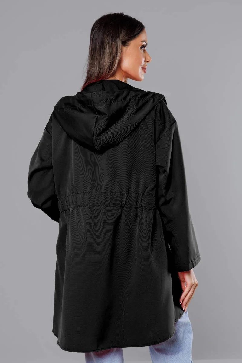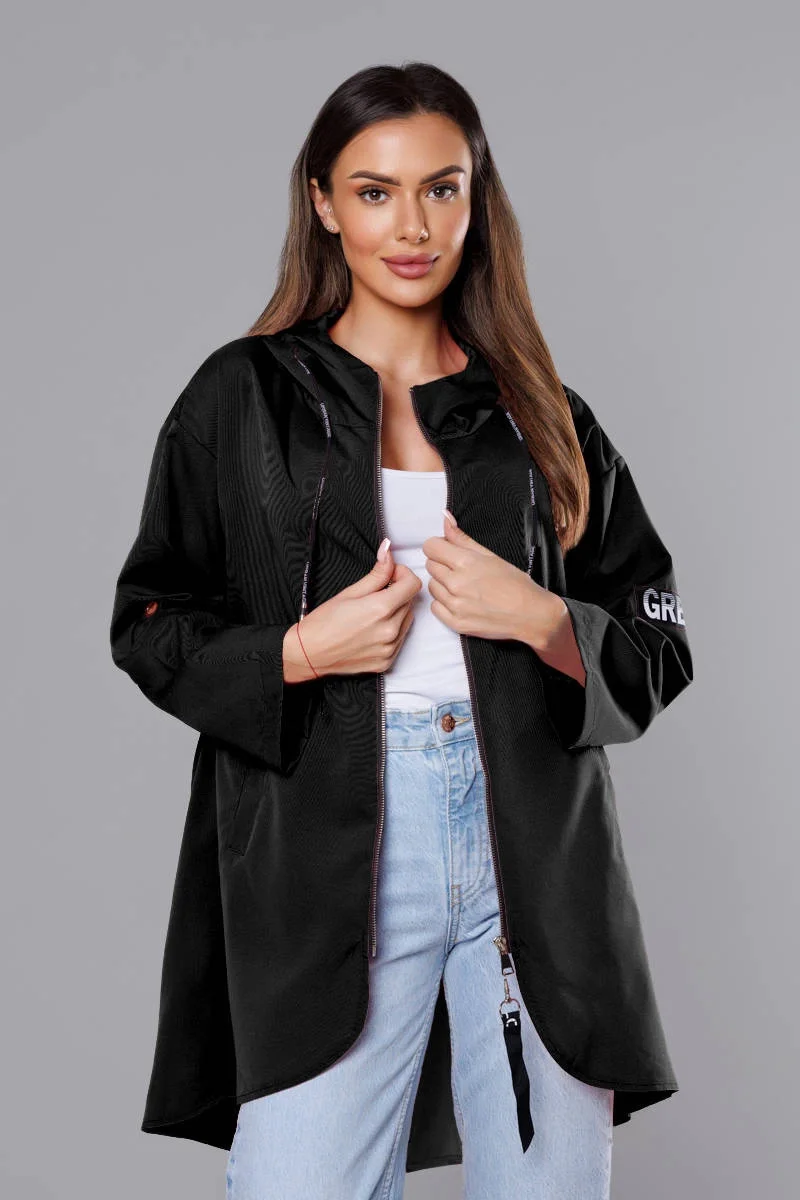 Přehoz se zapíná zipem a má dvě kapsy bez zapínání. Vzadu je v pase guma. Rukávy je možné ohrnout. Přední část modelu má délku k bokům a zadní část má délku do poloviny stehen.