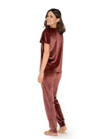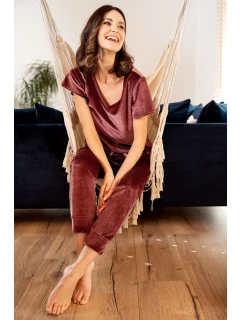Mega trendy velurová tepláková souprava v krásné vínové barvě. Ideální jako domácí oblečení, vysoce kvalitní, velmi ženské. Je to středně silná tkanina, která se dobře hodí i mezi ročními obdobími a je velmi pohodlná a pružná. Top s krátkými rukávy a špičatým výstřihem. Dlouhé volné kalhoty s žebrovanými lemy u kotníků. V pase je měkká gumička a mašle. Kapsy na bocích. Složení: 100% polyester.