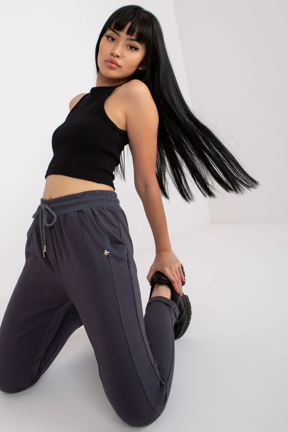 Tepláky s vysokým pasem, elastickým pasem a šňůrkou na stažení. Kalhoty s kapsami na bocích. Ideální pro každodenní nošení.