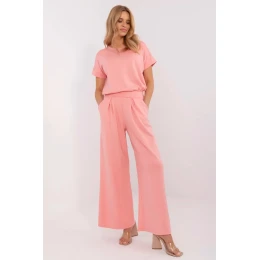 Stylové široké kalhoty typu palazzo, které kombinují pohodlí a eleganci v každodenních outfitcích. Vyráběné z měkké směsi viskózy, polyesteru a elastanu, poskytují pohodlí a volnost pohybu. Hladký materiál a široké nohavice dodávají moderní, lehce oversized charakter. Vysoký pas s elastickým pásem zajišťuje ideální přizpůsobení postavě, a ozdobné záložky na přední straně jim dodávají jedinečný vzhled. Model bez zapínání, vybavený praktickými bočními kapsami. Skvělé na každý den, jak do sportovních, tak do více elegantních outfitů.