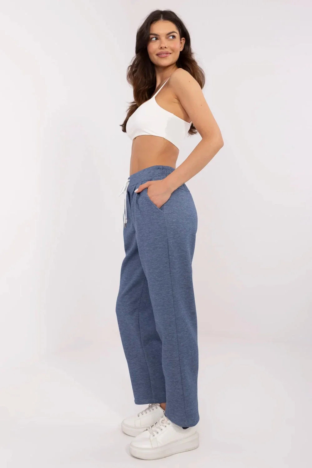 Tyto stylové tepláky ve volném provedení jsou ideální kombinací pohodlí a elegance. Vyrobené z vysoce kvalitní směsi viskózy, elastanu a polyesteru, zajistí měkkost, prodyšnost a ideální přizpůsobení postavě. Vysoký pas a praktické vázání v pase umožňují individuální přizpůsobení, zdůrazňující pas a zajišťující pohodlí po celý den. Klasické, přímé nohavice dodávají kalhotám univerzální charakter, díky čemuž se skvěle hodí jak do každodenních stylizací, tak do formálních kombinací do práce. Další výhodou jsou boční kapsy, které přidávají funkčnost a praktičnost. Hladký vzor a minimalistický design dělají z těchto kalhot skvělou základnu pro mnoho outfitů, od volných až po elegantní.