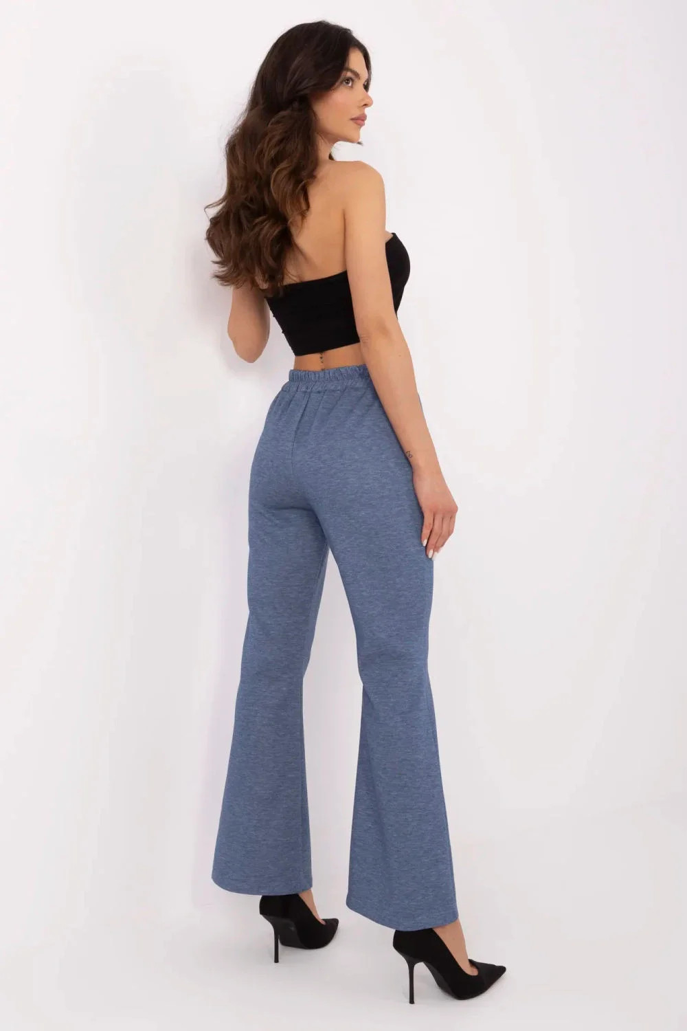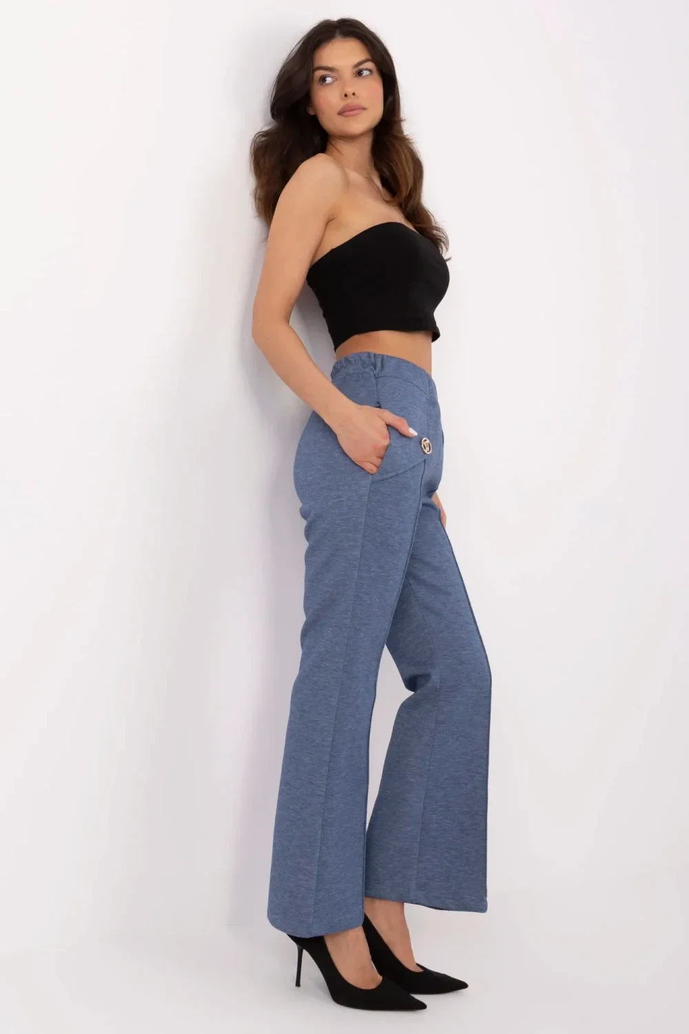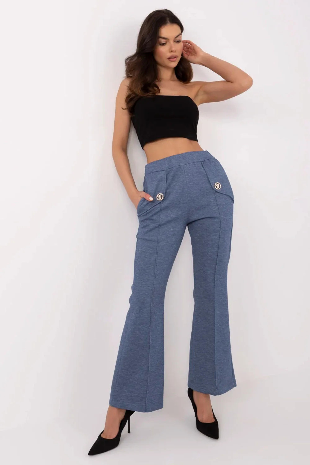 Tyto stylové tepláky kombinují pohodlí a módní střih zvonů, vytvářející ideální řešení pro každodenní nošení i do práce. Vyrobeny z vysoce kvalitní směsi viskózy, elastanu a polyesteru, poskytují měkkost, pružnost a skvělé přizpůsobení postavě. Vysoký pas a elastický pás zaručují pohodlí a zdůrazňují pas, zatímco široké nohavice dodávají siluetě elegantní a prodlužující efekt. Boční kapsy s funkcí vkládání zvyšují funkčnost kalhot a činí je praktickou volbou na každou příležitost. Hladký vzor a minimalistický design doplňují extra odnímatelné brože, které umožňují personalizaci stylizace. Tyto kalhoty jsou spojením moderního stylu a pohodlí, ideální pro ženy, které ocení eleganci v neformálním provedení.