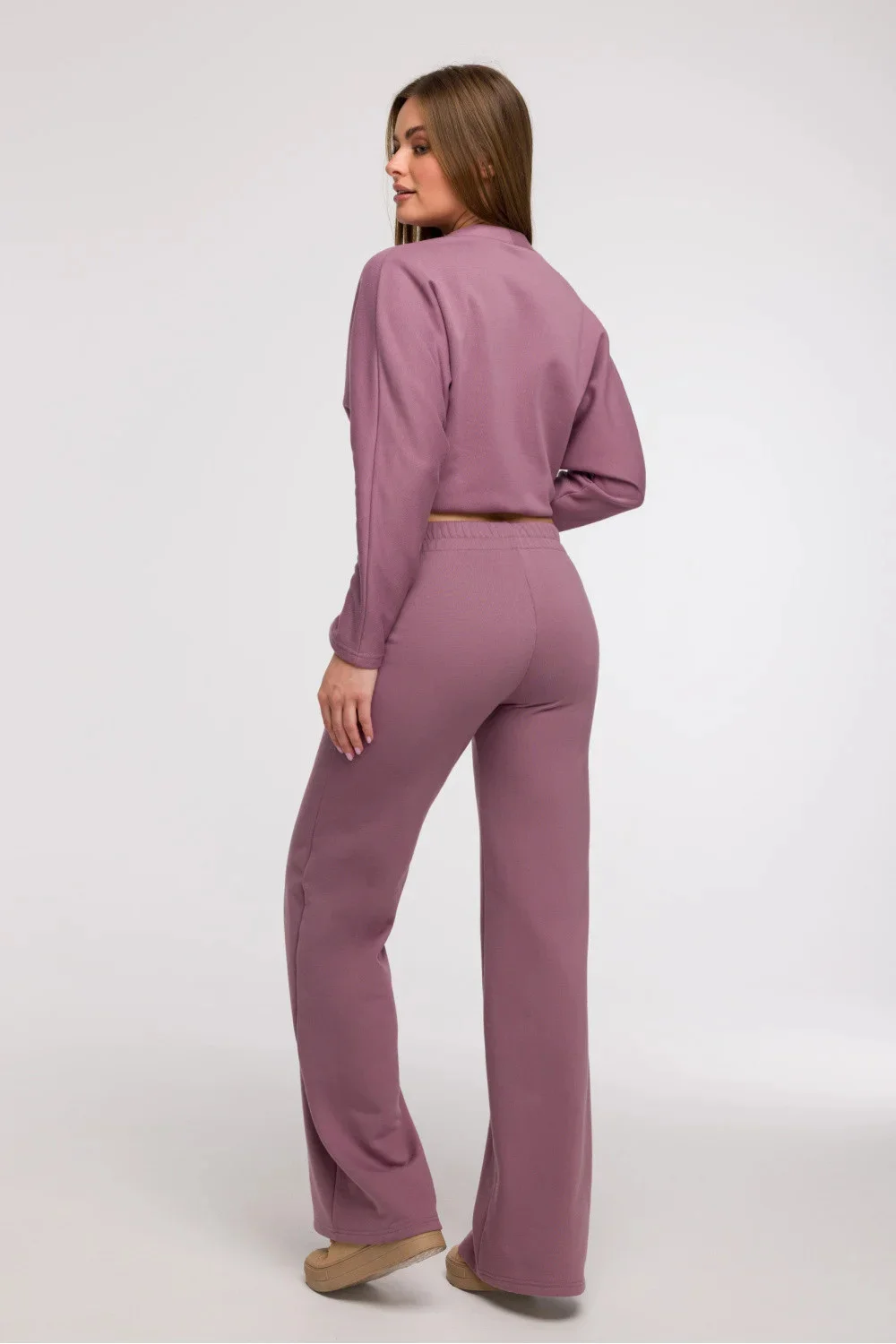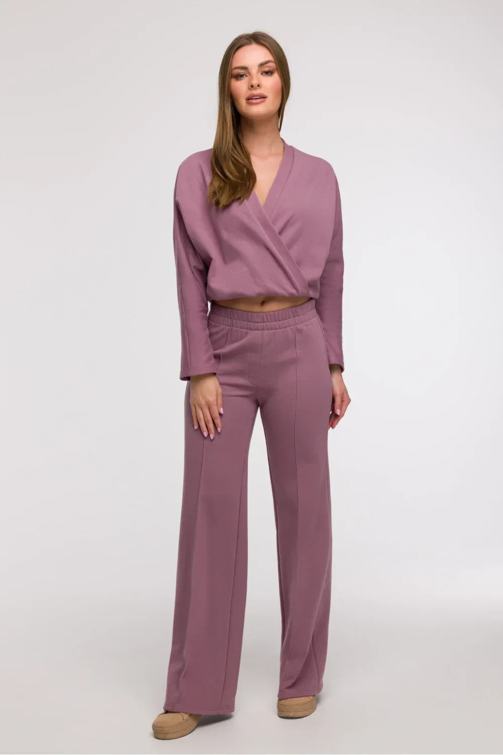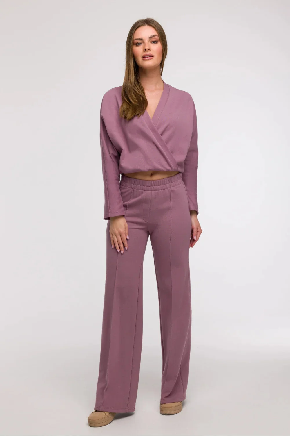 Stylové a pohodlné široké nohavice typu wide leg jsou ideální volbou pro ženy, které ocení pohodlí a módní vzhled. Vyrobena z jednobarevné látky bez další podšívky, bude skvělým doplňkem jak do každodenního, tak do trochu elegantnějšího smart casual stylu. Široké, dlouhé nohavice s prošíváním vpředu dodávají postavě lehkost a opticky prodlužují nohy. Kalhoty mají klasický, normální pas a pohodlné zapínání na gumu v pase, což zajišťuje volnost pohybu a snadné přizpůsobení. Chybějící kapsy zdůrazňují minimalistický charakter modelu. Střih byl navržen tak, aby ladil s různými typy postav, zejména se bude skvěle hodit k postavě typu hruška, pomáhající vyrovnat proporce těla. Navrženo a ušito v Polsku.